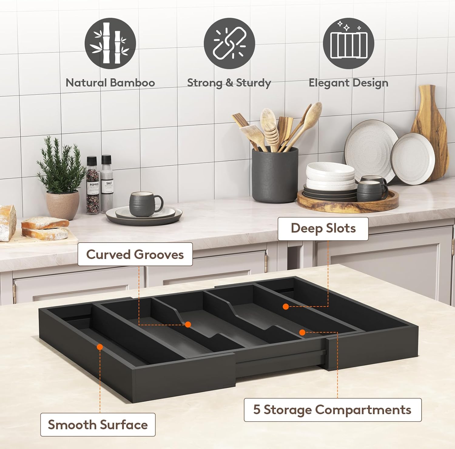 Lifewit Utensil Organizer for Kitchen Drawer, Expandable Cooking Utensil Tray, Bamboo Cutlery Silverware Flatware Holder, Adjustable Spatula Tools and Gadgets Storage Divider, Large, Black