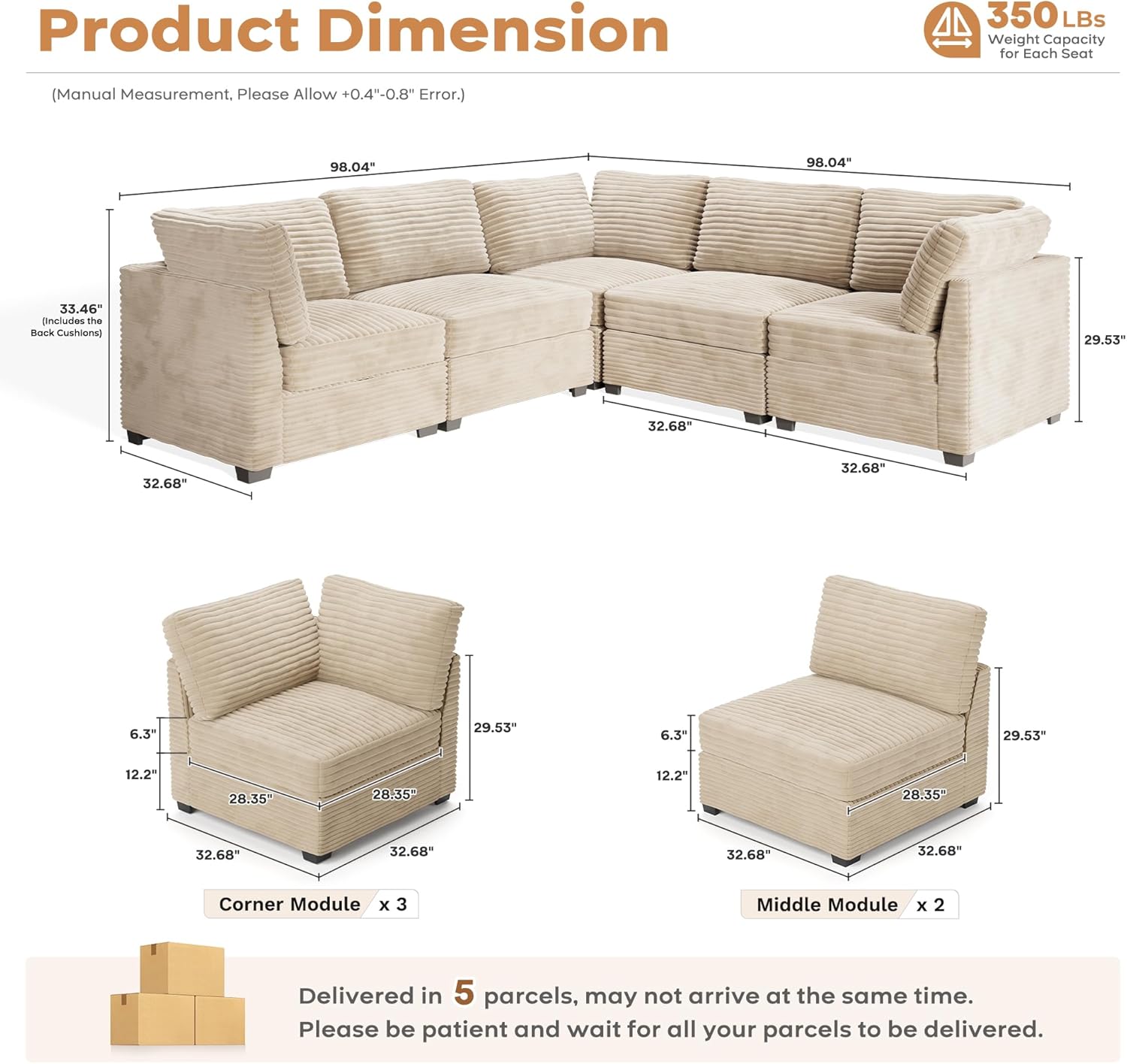ovios Sectional Sofa Couch with L-Shape Chaise Convertible, Comfy Modular Cloud Couches with Deep Seat, Modern Upholstered Plush Corduroy Sofas Set for Living Room, 5-Seater, Beige