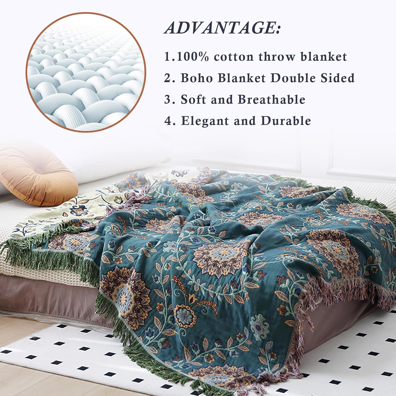 Snycler Boho Throw Blanket for Bed - 100% Cotton Ultra Soft Rustic Quilt - Blue Green Floral Printed Farmhouse Decor Bed Blankets, 60"×80" All Season Rustic Throw for Sofa Couch Chair