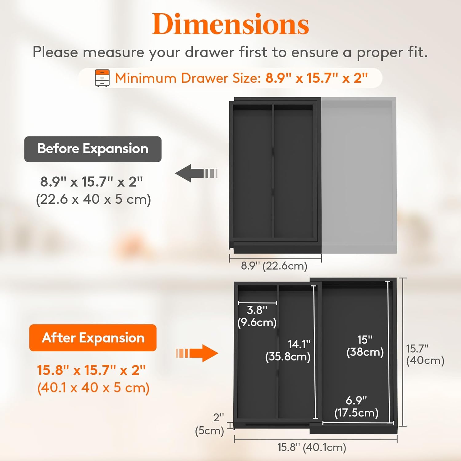 - Expandable Design: This utensil drawer organizer can expand from two compartments to three and measures 15.8 x 15.7 x 2 inches after expansion, providing extra storage space. With an adjustable width range of 8.9-15.8 inches it ensures a perfect fit for most drawers