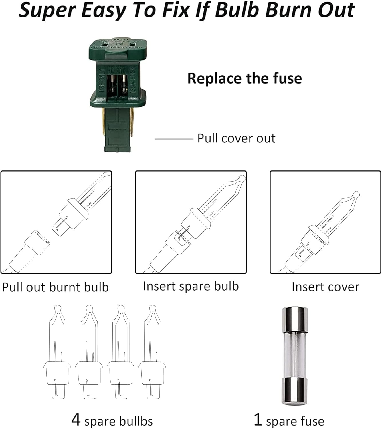 - High Quality: The Christmas tree lights is IP 44 waterproof, build-in 3A fuse and pass with UL certified, is safety for both indoor and outdoor decorations. Each bulb works individual, others will work well when one bulb is defective. Just use the spare bulbs to replace the defective bulb.
