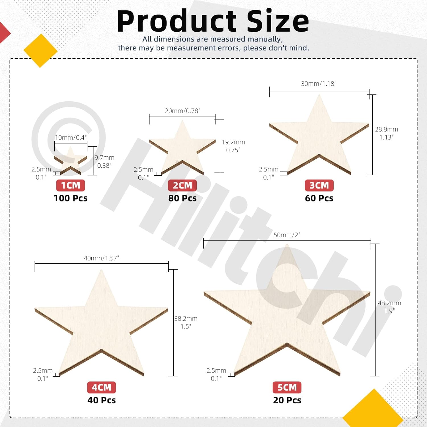 - ⭐【What You Will Get】In this kit, you will get 100pcs 10mm/0.4" unfinished wooden stars, 80pcs 20mm/0.78" unfinished wooden stars, 60pcs 30mm/1.18" unfinished wooden stars, 40pcs 40mm/1.57" unfinished wooden stars, 20pcs 50mm/0.2" unfinished wooden stars, in total 300pcs. Sufficient quantity and rich sizes can meet your daily DIY use.