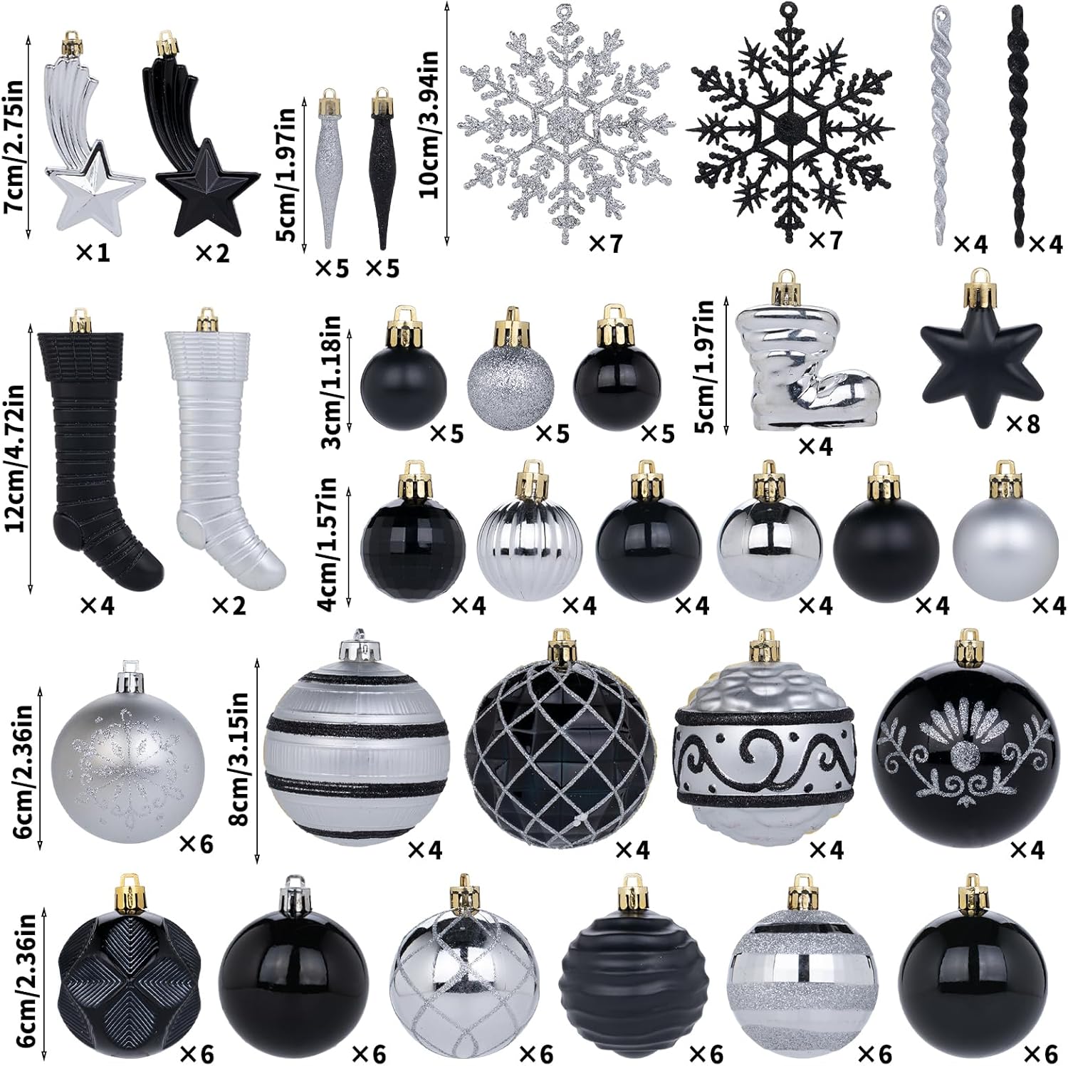 150PCS Black and Silver Christmas Ornaments - Shatterproof Ball Set, Assorted Baubles Hanging Decorations for Xmas Tree, Home, Festival, Party, Wedding