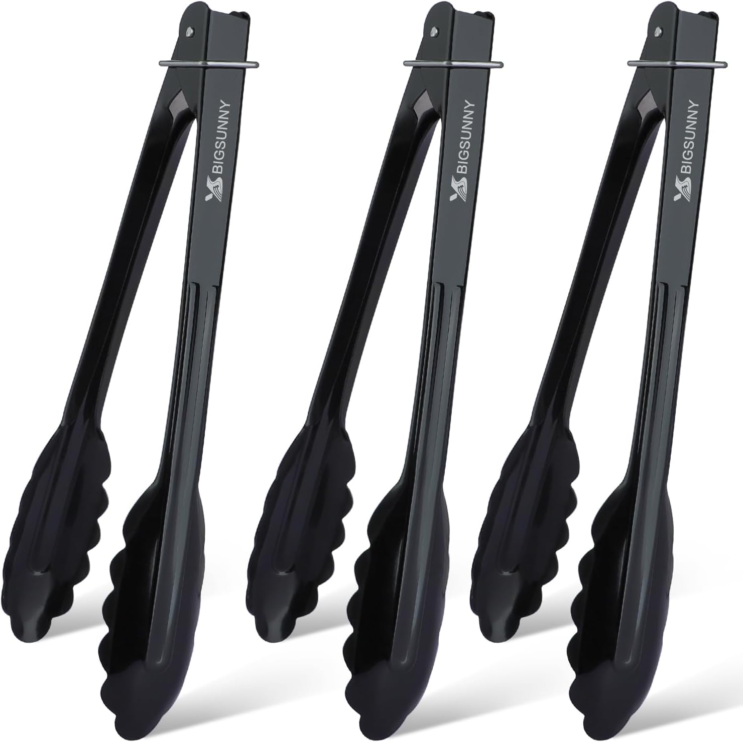 MSY BIGSUNNY 9 Inch Kitchen Food Tongs, Buffet Tongs, Serving Tongs, Black Aluminum Tongs - Set of 3