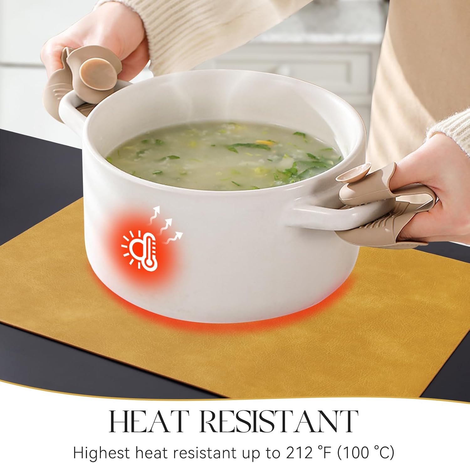 - HASSLE-FREE CLEANING: Our faux leather placemats are designed to be 100% waterproof to better protect the table from grease and grime compared to woven and fabric placemats. If the placemats get stained with sauce or food residue, simply wipe with a cloth or rinse with water.