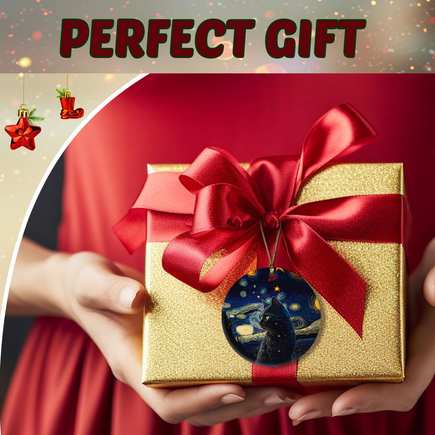 Black Cat Christmas Ornaments,Christmas Cat Gifts for Cats Mom Women,Starry Night Ceramic Hanging Ornaments