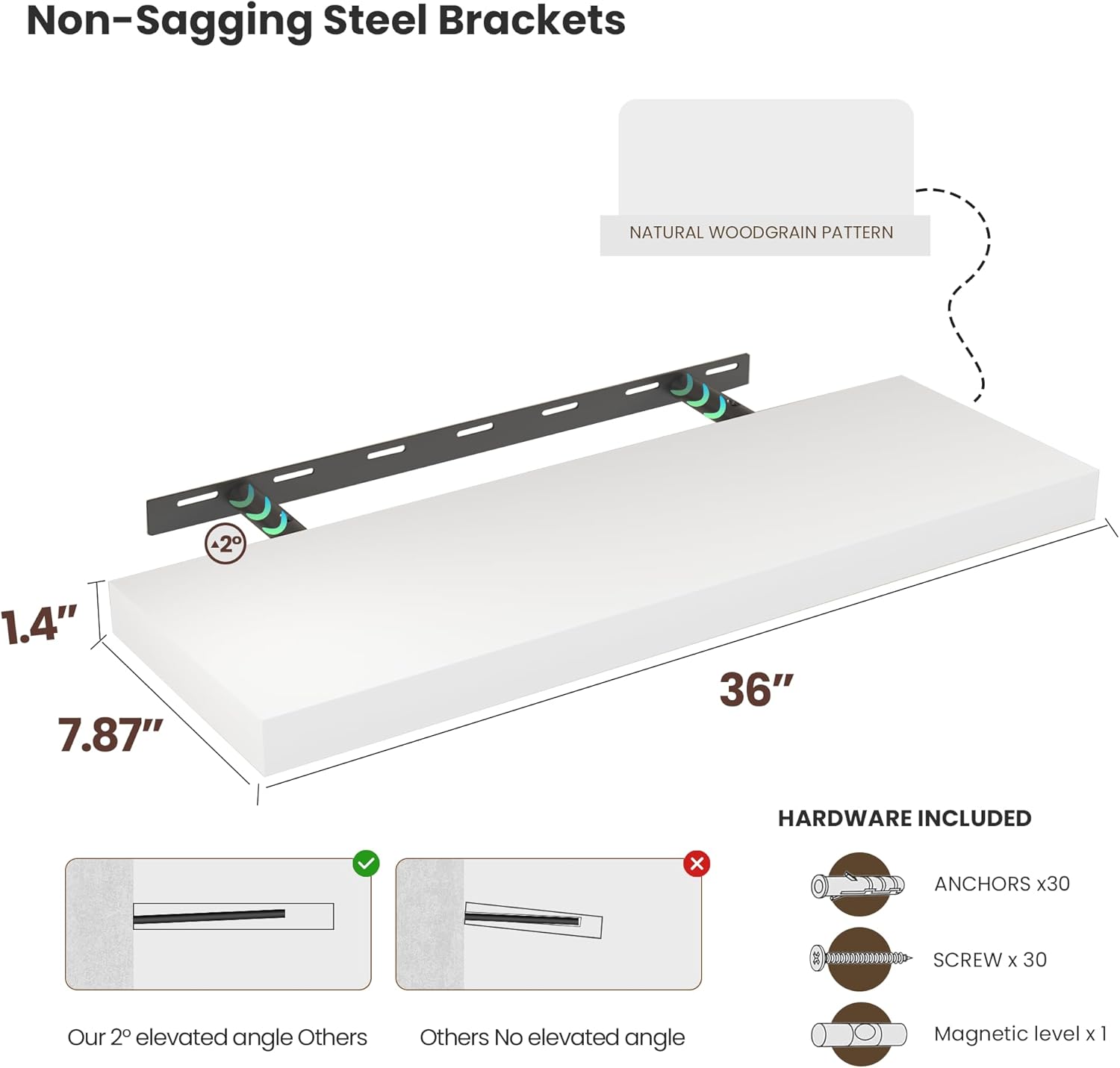 Floating Wood Shelves for Wall 36 Inches x 8”x 1.4” Shelf Floating Home Decor, Heavy Duty Shelf Hold 80 lbs, Wall Shelves for Bathroom Living Room Kitchen Bedroom Office - Set of 2 White