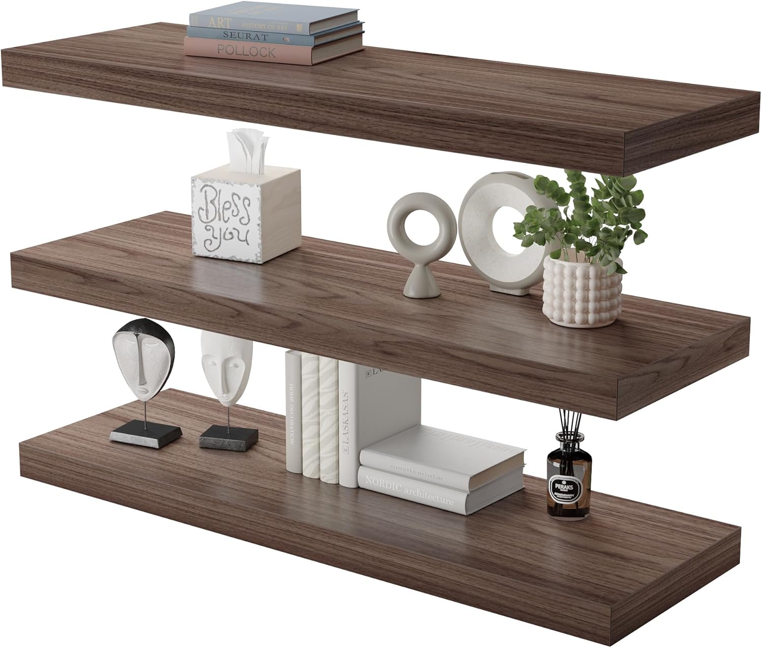 Large Floating Shelves for Wall Set of 3 Wooden Wall Shelves 24 in x 12.75 in x 2 in Room Decor Long Shelf with Invisible Wall Mount Bracket for Bedroom Kitchen Living Room Walnut