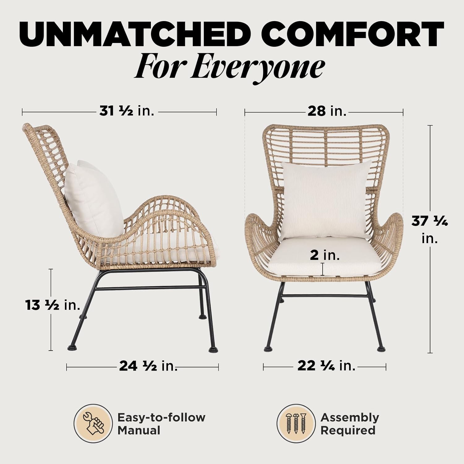 - β EASY TO CARE WICKER PATIO CHAIRS. Manuals and tools are included for quick assembly; Our wicker dining chairs set of 2 are easy to clean with a damp cloth; To extend the life of your wicker dining chair, please move it inside when not in use.