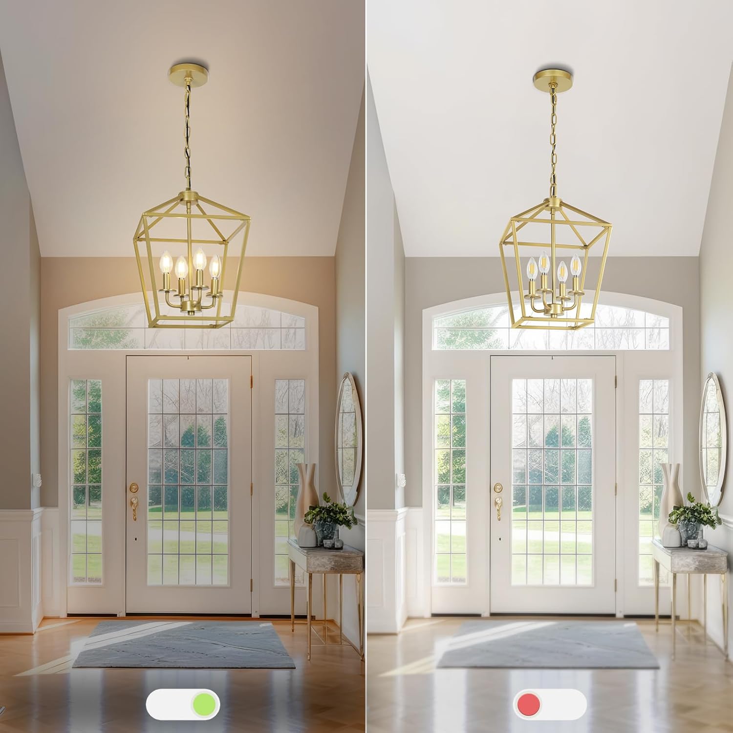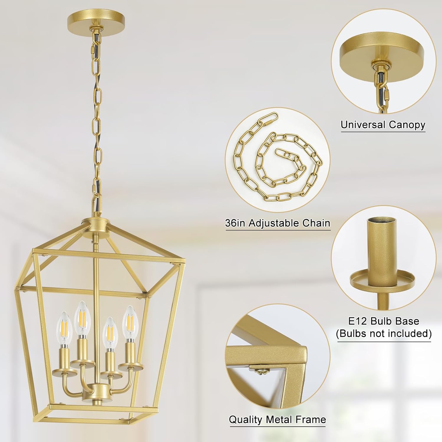 - Gold and Stylish Appearance: Featured with gold center candlestick and geometric outward appearance, the geometric lantern chandelier is a wonderful addition to add industrial touch to your home dรฉcor. Artistic and eye-catching, it can perfectly blend in any place such as bedroom, living room, bathroom, dining room, hallway or kitchen island (indoor use only)