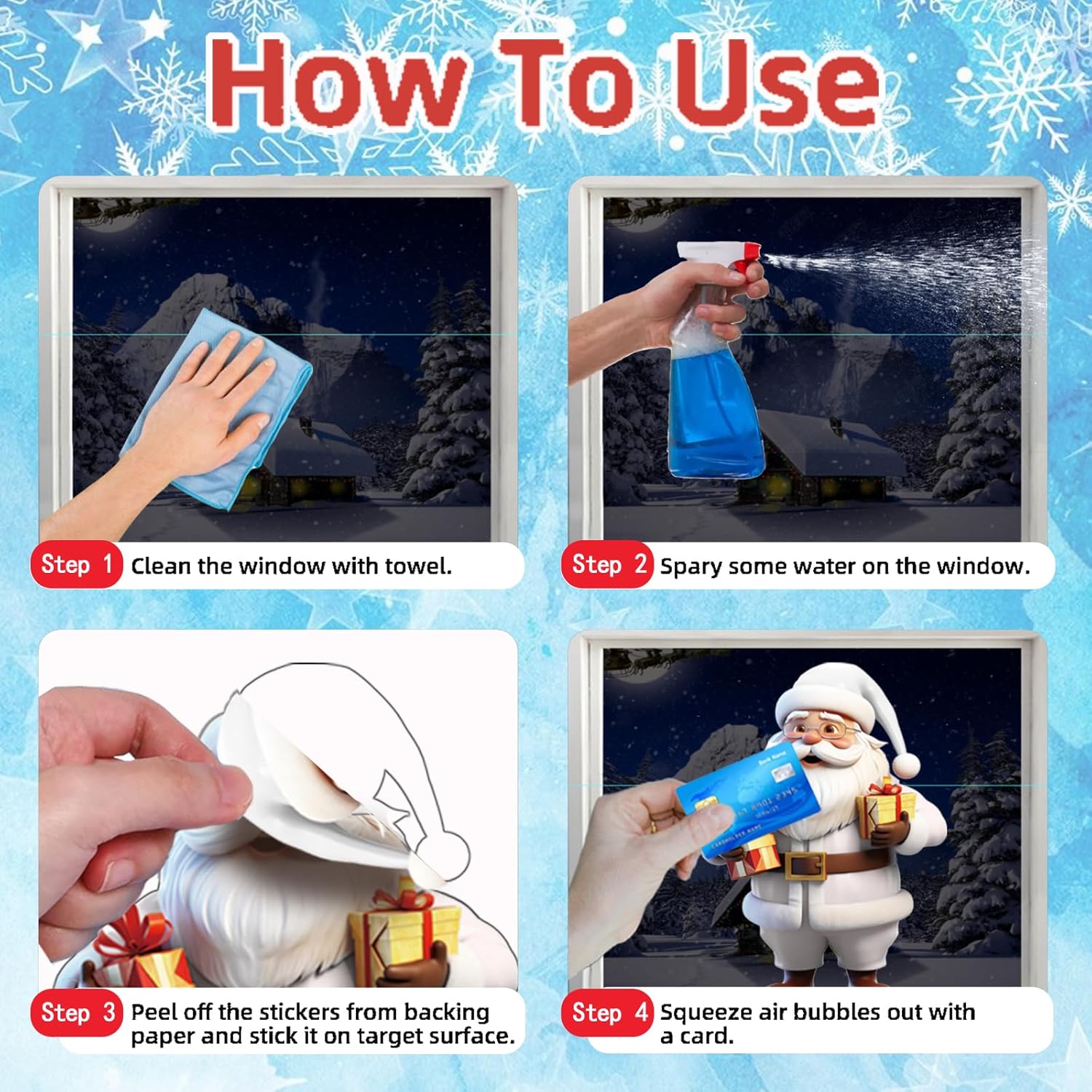 - EASY TO USE: Christmas window stickers use the electrostatic adhesion principle and do not require adhesives or tapes. Start by cleaning your window surface, then spray a little water on the glass. Peel off the stickers and place them where you like,it's that easy! You can stick them on smooth surface like glass, mirror, windows, glass storm door and refrigerator.