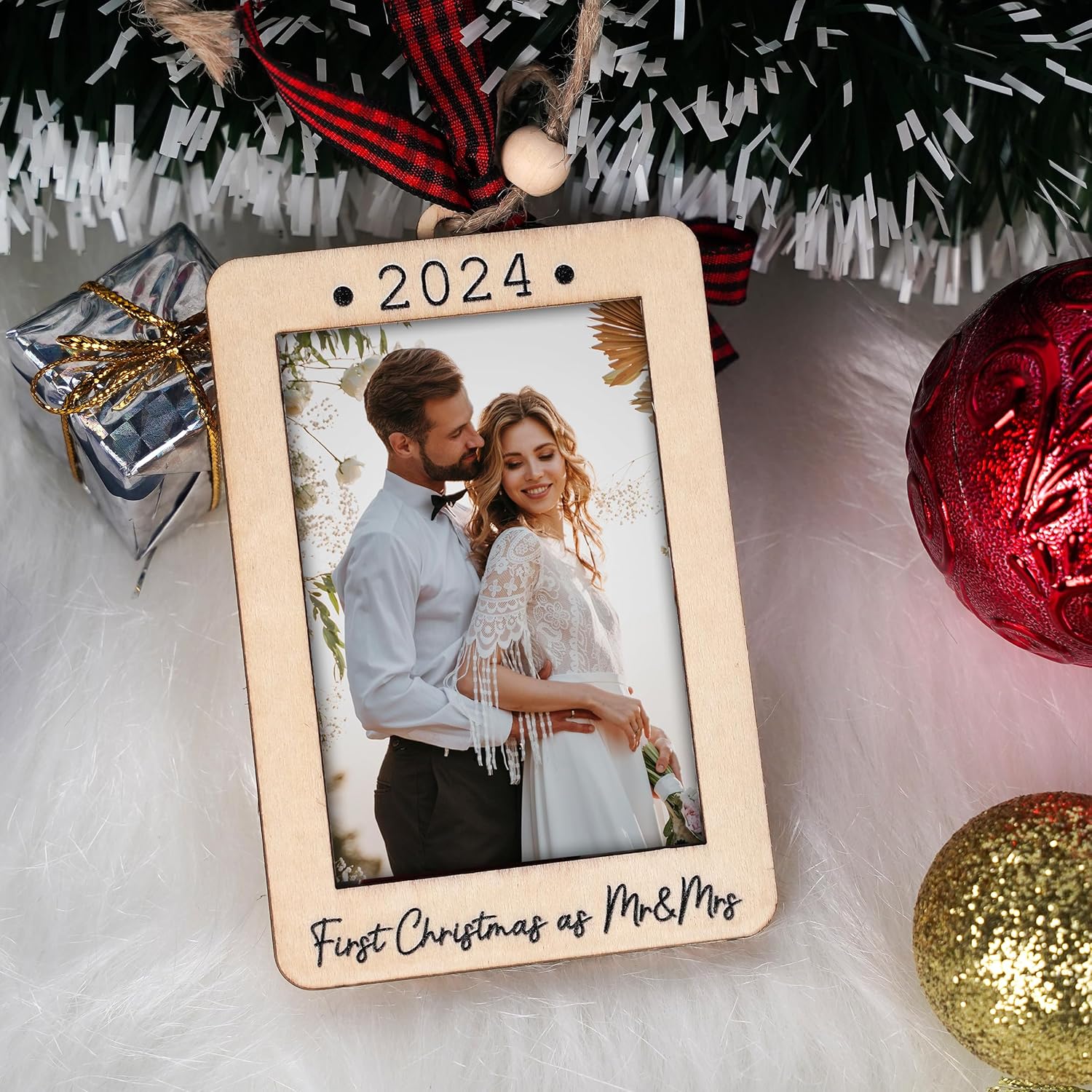 Christmas Photo Frame Ornament, 2025 Ornament, Wooden Picture Frame Ornaments With Hanging String (First Christmas As Mr & Mrs (Portrait))
