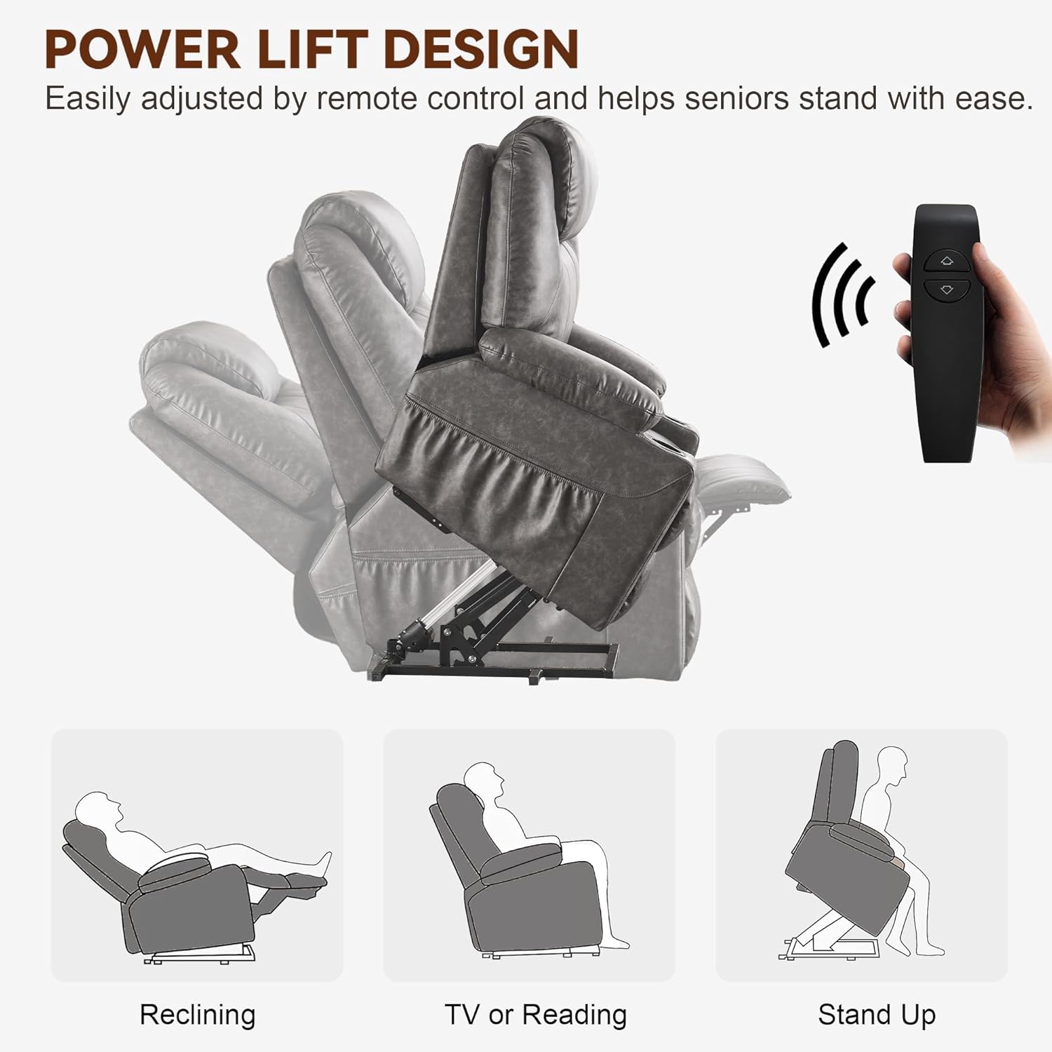 SALOHZA Power Lift Recliner Chair for Elderly with Massage and Heat for Living Room, Electric Recliner Chair for Adults with USB/Type C Port/Cup Holders, PU Faux Leather, Grey