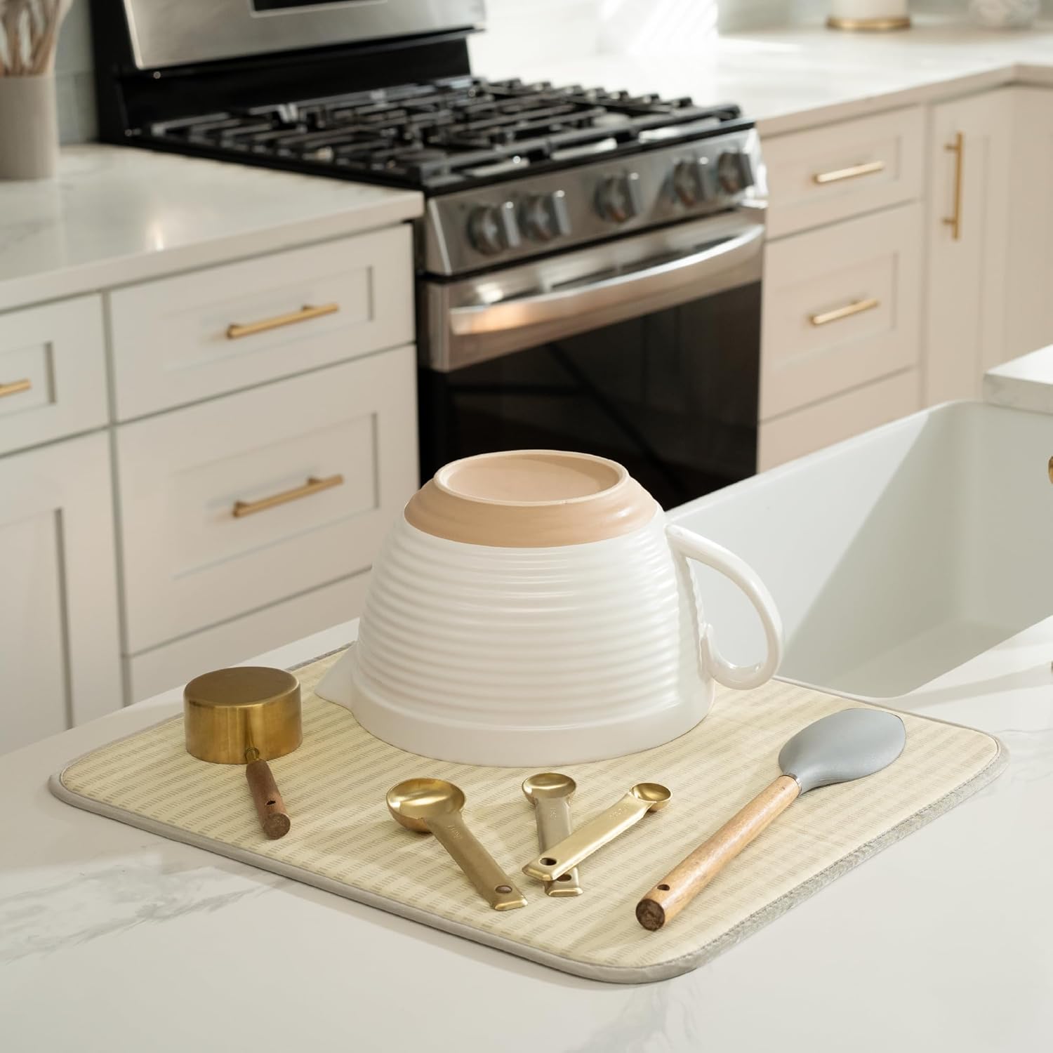 S&T INC. Dish Drying Mat, 16” x 18”, Absorbent Microfiber Kitchen Counter Mat, Dish Drying Pad for Dishes, Utensils, Pots and Pans, Large, Cream Distressed Lines