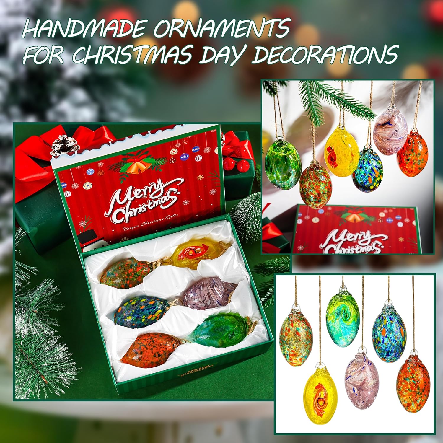 - Blown Glass Christmas Ornaments:This set of 6 glass ornaments is coming with a nice Christmas gift box.Each ornament is about 3.9(l)*2.1(W).The total weight of 6 glass egg ornaments is about 816 gram.