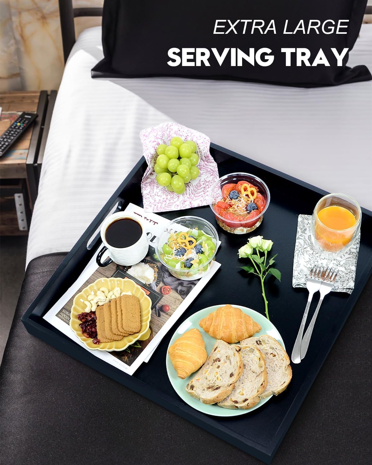 - STYLISH & ELEGANT - With its silky black appearance, this large tray is a great accent piece for any space. Not only does it serve as an ottoman tray for living room, but it also makes a beautiful display on your coffee table, kitchen countertop, or bed bench.