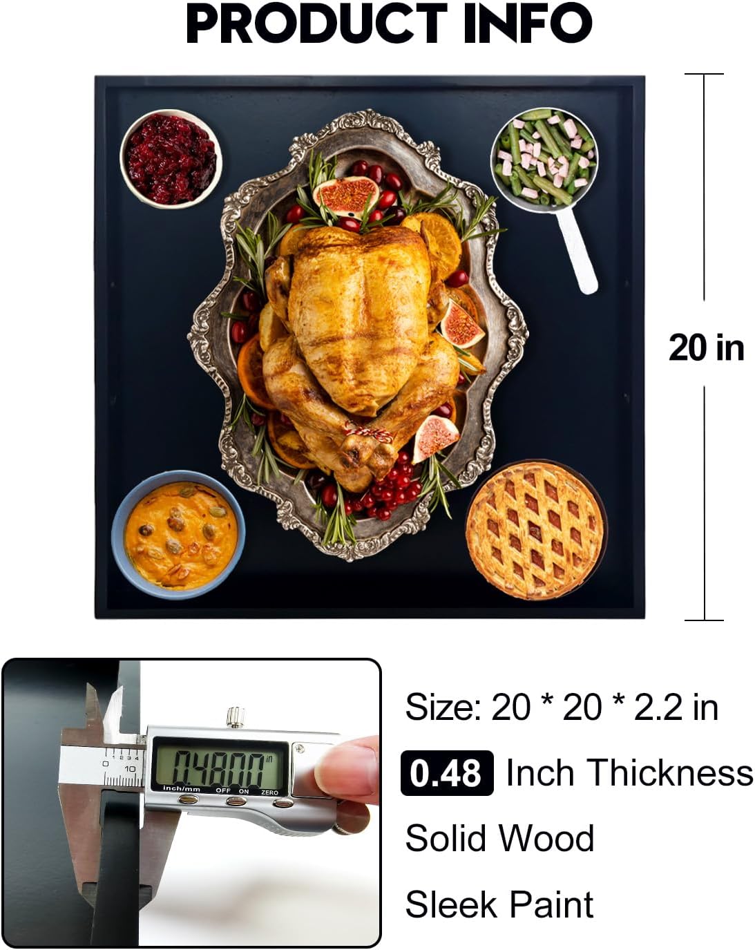 - 20 INCH OTTOMAN TRAY - This extra large serving tray is perfect for a variety of uses. Measuring 20" x 20" x 2.2", it’s ideal for serving drinks on the coffee table, organizing items on your couch, or using it in the kitchen. This decorative tray adds both function and style to your home.