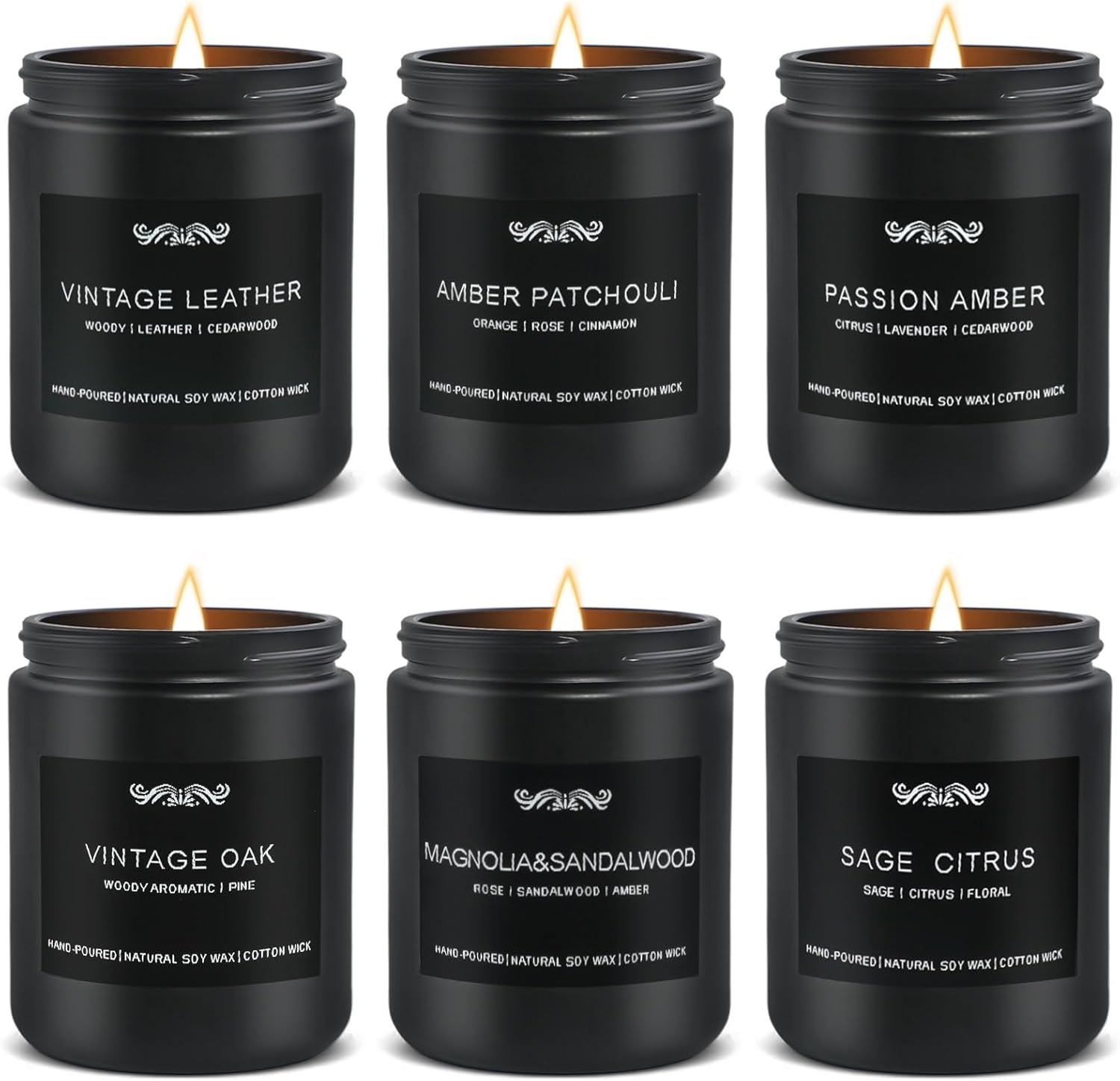 - Men Candles Set: We have carefully blended 6 different fragrance types, Vintage Oak, Vintage Leather, Patchouli Amber, Magnolia & Sandalwood, Sage & Citrus, Passion Amber.Each scent is carefully blended by professional perfumers, with rich layers and long-lasting charm, which can bring you a unique olfactory experience.