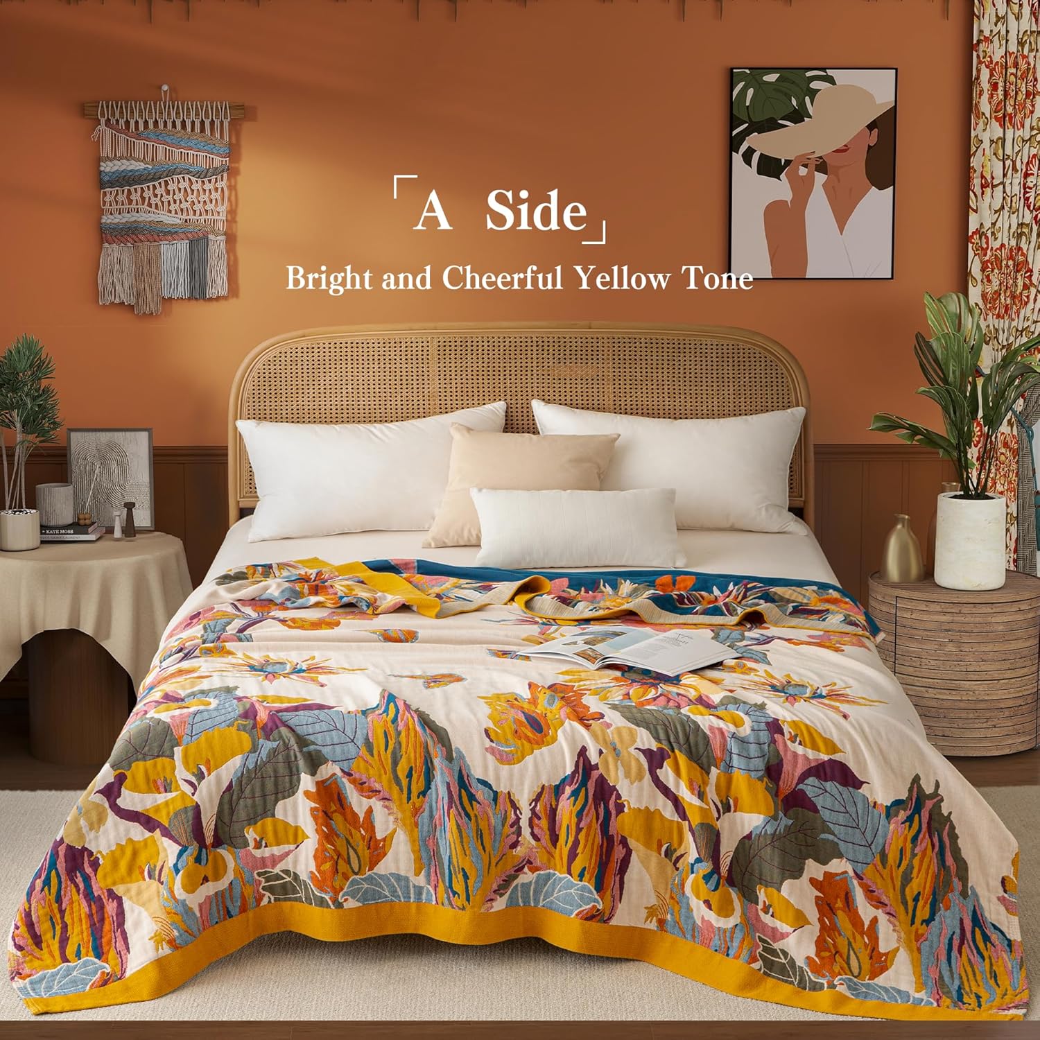 Boho Throw Blanket Full Size, Extra Large Soft Cozy Cotton Muslin Quilt Blanket for Bed Decor, Floral Patterned Couch Sofa Chair Cover, Vintage Farmhouse Cottage Woven Blanket, Yellow&Blue