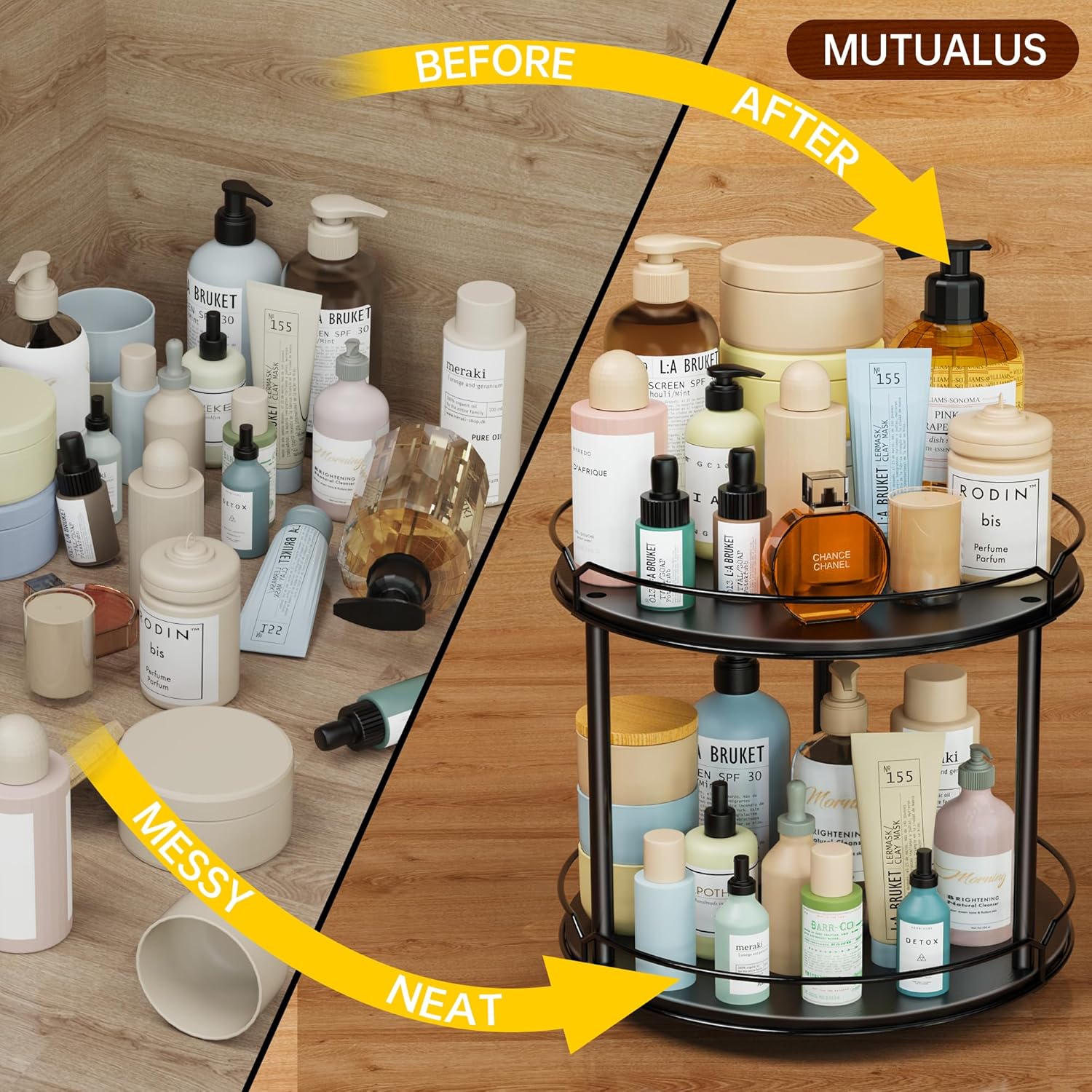 - 2. Efficient Design for Easy Access: Whether you're grabbing your favorite spices or toiletries, our Lazy Susan organizer makes it easy. The two-tier design allows for efficient storage, while the rotating design ensures easy access to all your items