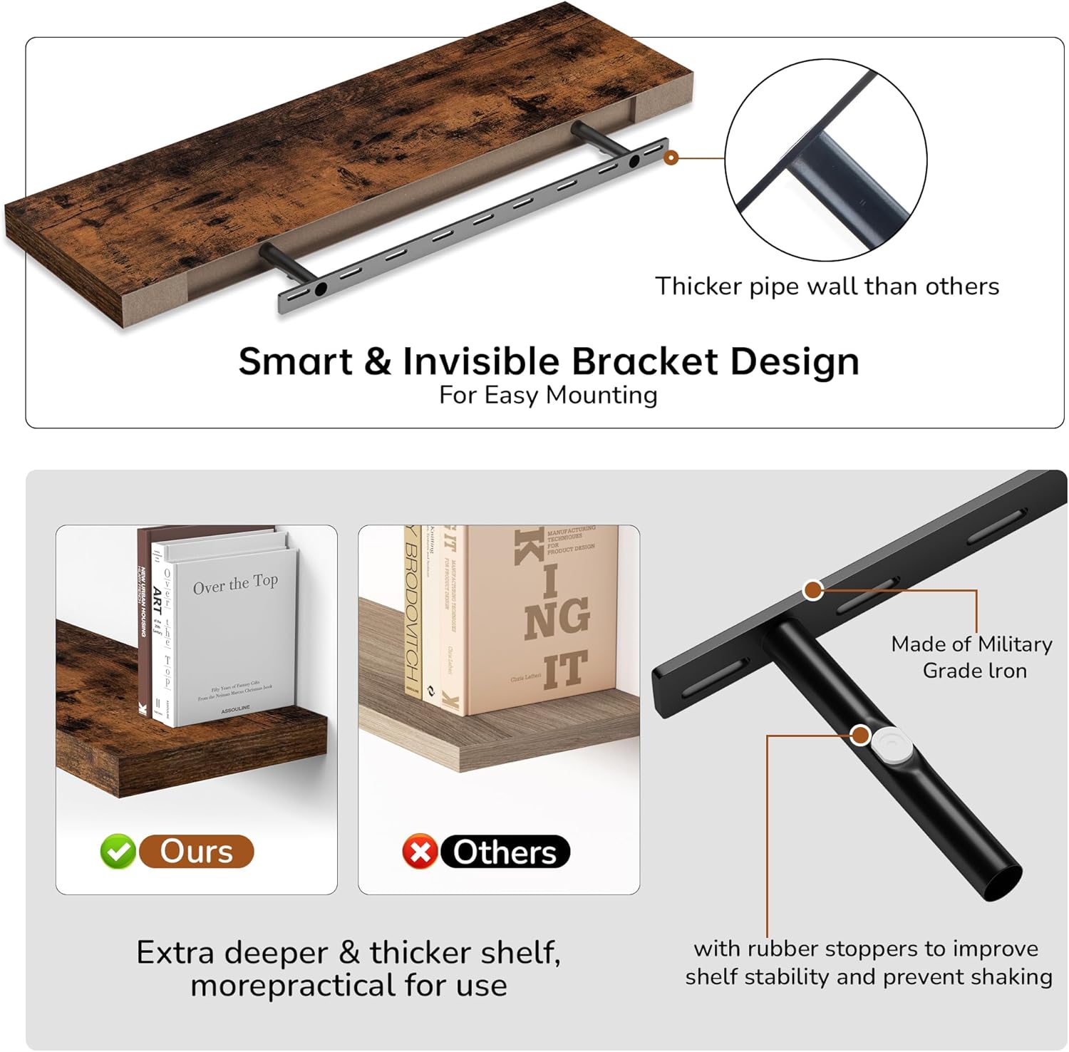 Fun Memories 36 Inch Floating Shelves - Deep Rustic Wooden Wall Shelves - Extra Deeper & Thicker Wall Mounted Storage Shelf for Bedroom, Kitchen, Farmhouse - 2 Pack, Rustic Brown