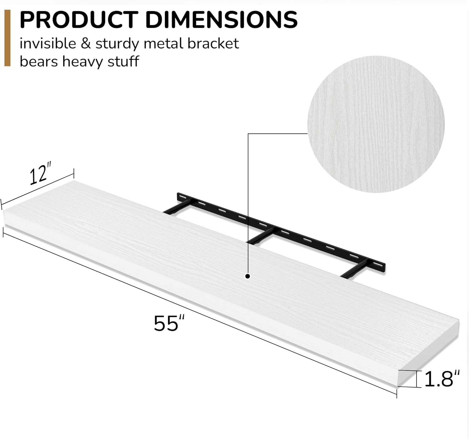 - Extra Deeper & Thicker - Each board measures 55"W x 12"D x 1.8"H. Extra deeper and thicker design in order to bring maximizes storage space and weight capacity, even hold up to 80 lb each. This floating shelf taking up zero square feet, reduces clutter and highlights décor in compact spaces.