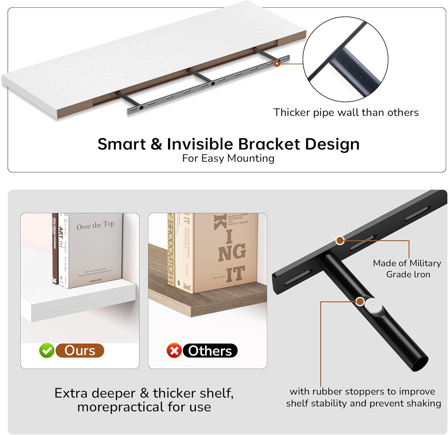 - Easy to Assemble & Install: Each shelf comes with everything you need for quick and easy assembly: durable steel invisible brackets, toggle bolts for drywall, and a straightforward instruction manual. With just one or two boards and a few screws, you can have the shelf up in no time. The included step-by-step instructions make the installation process hassle-free, and our customer support team is always available if you need assistance.