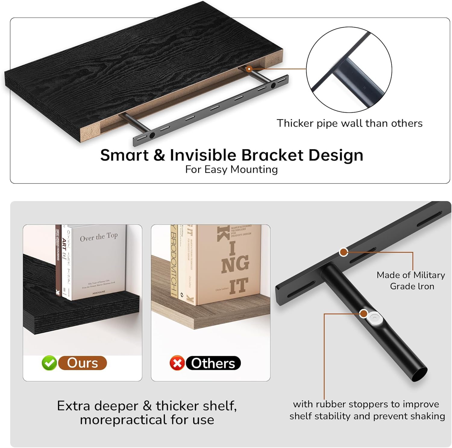 - Extra Deeper & Thicker - Each board measures 24"W x 12"D x 1.5"H. Extra deeper and thicker design in order to bring maximizes storage space and weight capacity, even hold up to 50 lb each. This floating shelf taking up zero square feet, reduces clutter and highlights décor in compact spaces.