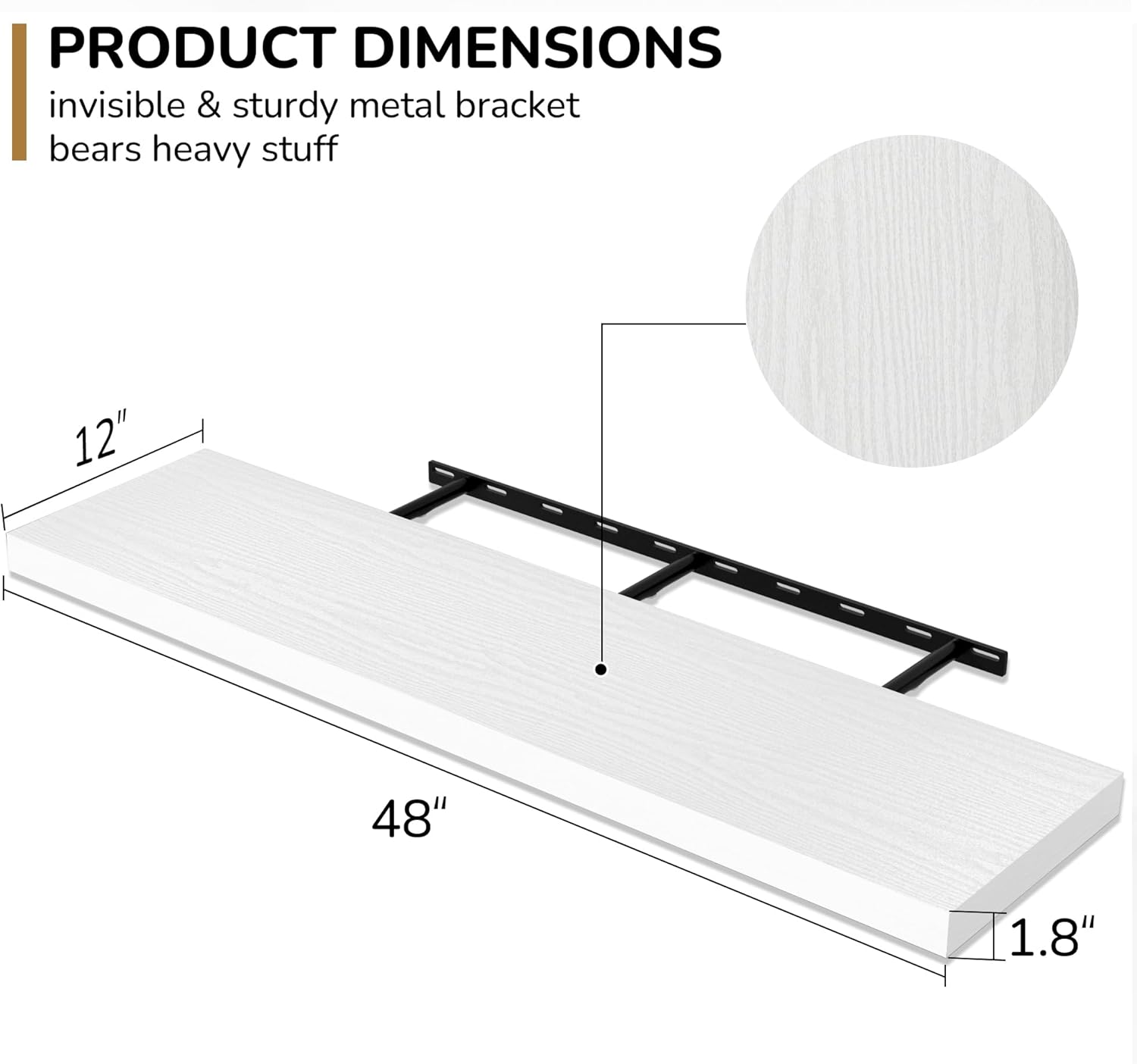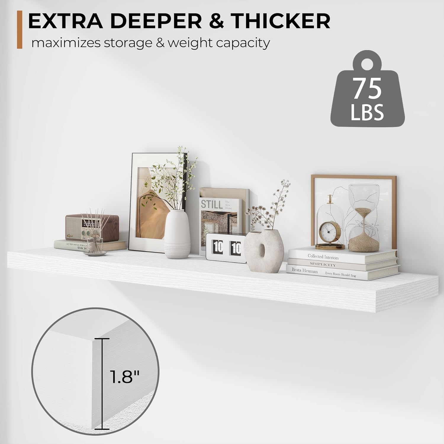 - Extra Deeper & Thicker - Each board measures 48"W x 12"D x 1.8"H. Extra deeper and thicker design in order to bring maximizes storage space and weight capacity, even hold up to 75 lb each. This floating shelf taking up zero square feet, reduces clutter and highlights décor in compact spaces.