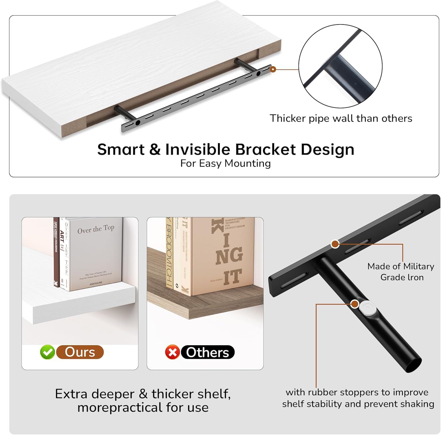 - Easy to Assemble & Install: Each shelf comes with everything you need for quick and easy assembly: durable steel invisible brackets, toggle bolts for drywall, and a straightforward instruction manual. With just one or two boards and a few screws, you can have the shelf up in no time. The included step-by-step instructions make the installation process hassle-free, and our customer support team is always available if you need assistance.