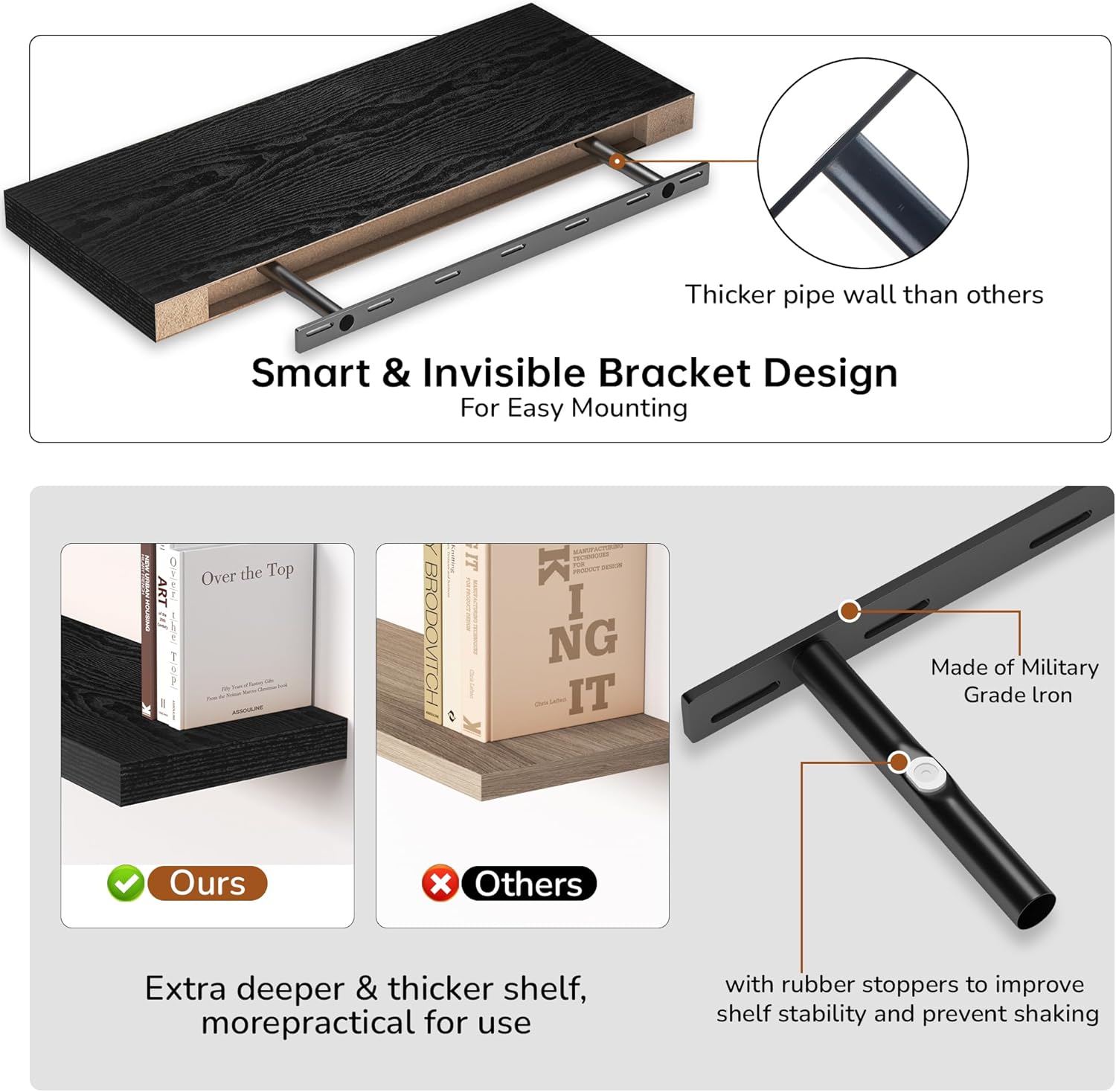 - Extra Deeper & Thicker - Each board measures 24"W x 8"D x 1.5"H. Extra deeper and thicker design in order to bring maximizes storage space and weight capacity, even hold up to 50 lb each. This floating shelf taking up zero square feet, reduces clutter and highlights décor in compact spaces.
