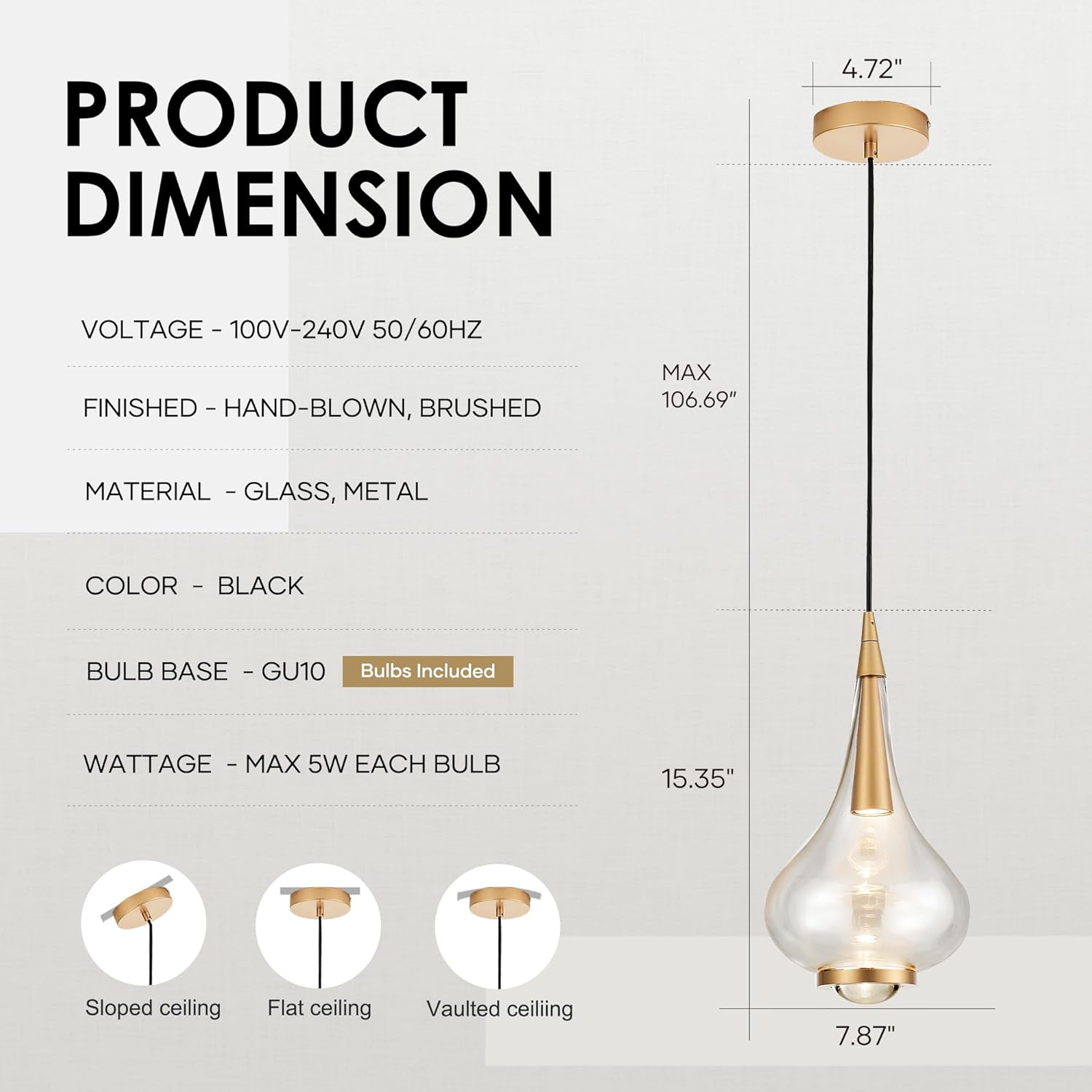 - 【Adjustable Height】The teardrop chandelier has a height of 11.81 inches, a diameter of 4.92 inches, and comes with an adjustable wire that is 118.11 inches long. The modern chandelier is compatible with flat, pitched, and vaulted ceilings, and the height can be easily customized according to your preference.
