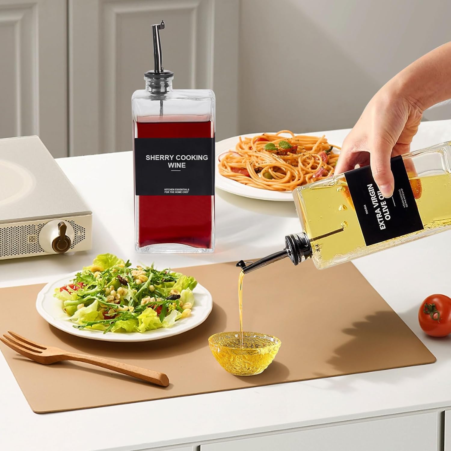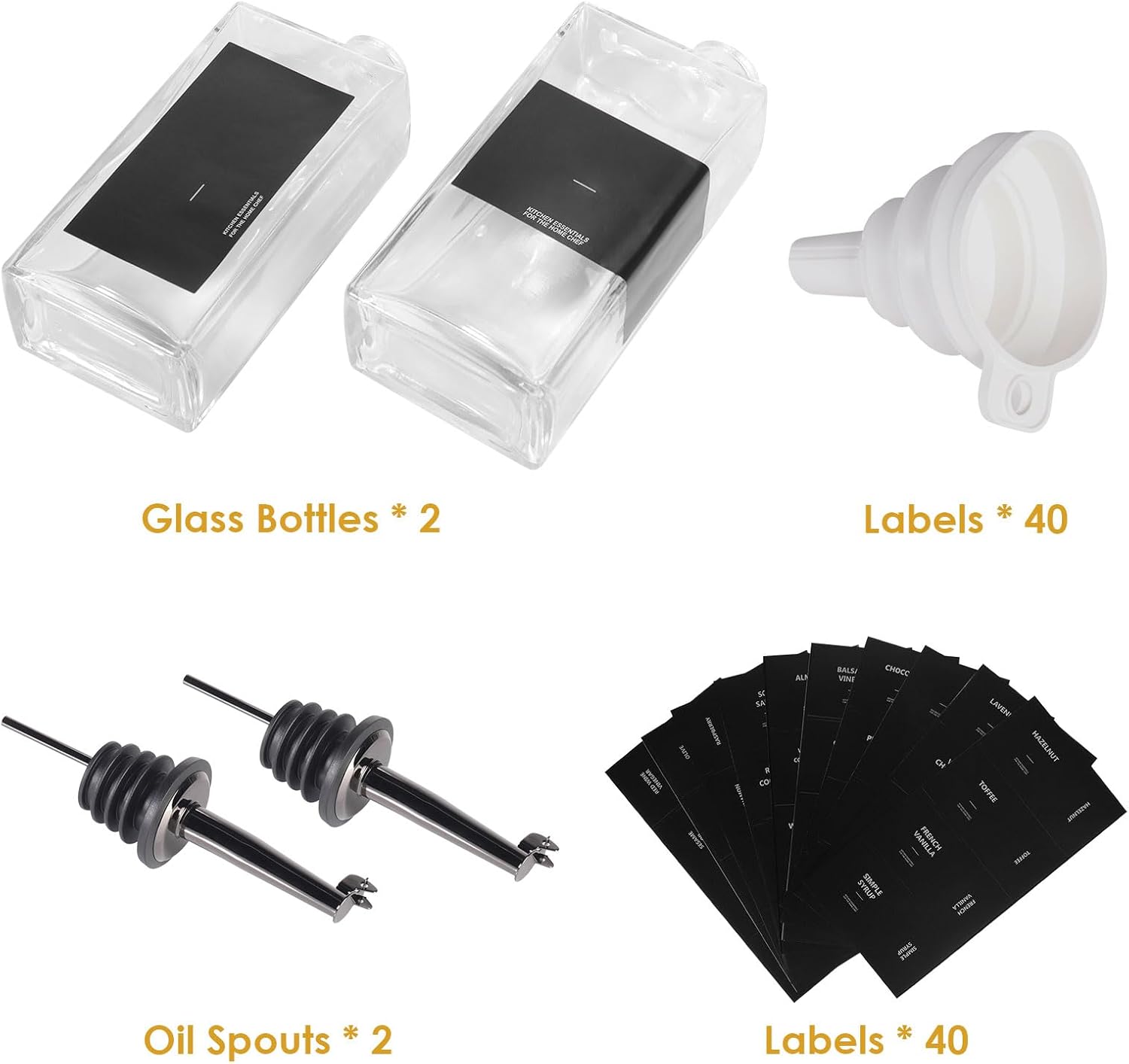 - [VERSATILE OIL DISPENSER SET] OKYUK Oil dispenser set comes with 2 * glass oil bottles, 2 * drip-free oil spouts, 1 * silicone funnel, and 40 * labels. These oil dispensers are suitable to use for your kitchen, and they are also practical for holding or dispensing oil, vinegar, soy sauce, cooking wine, or mouthwash. This 2pcs oil dispenser bottle set meets most of your daily needs and is perfect to share with your lover, family, and friends