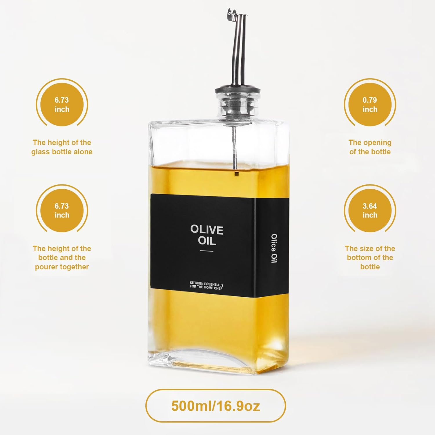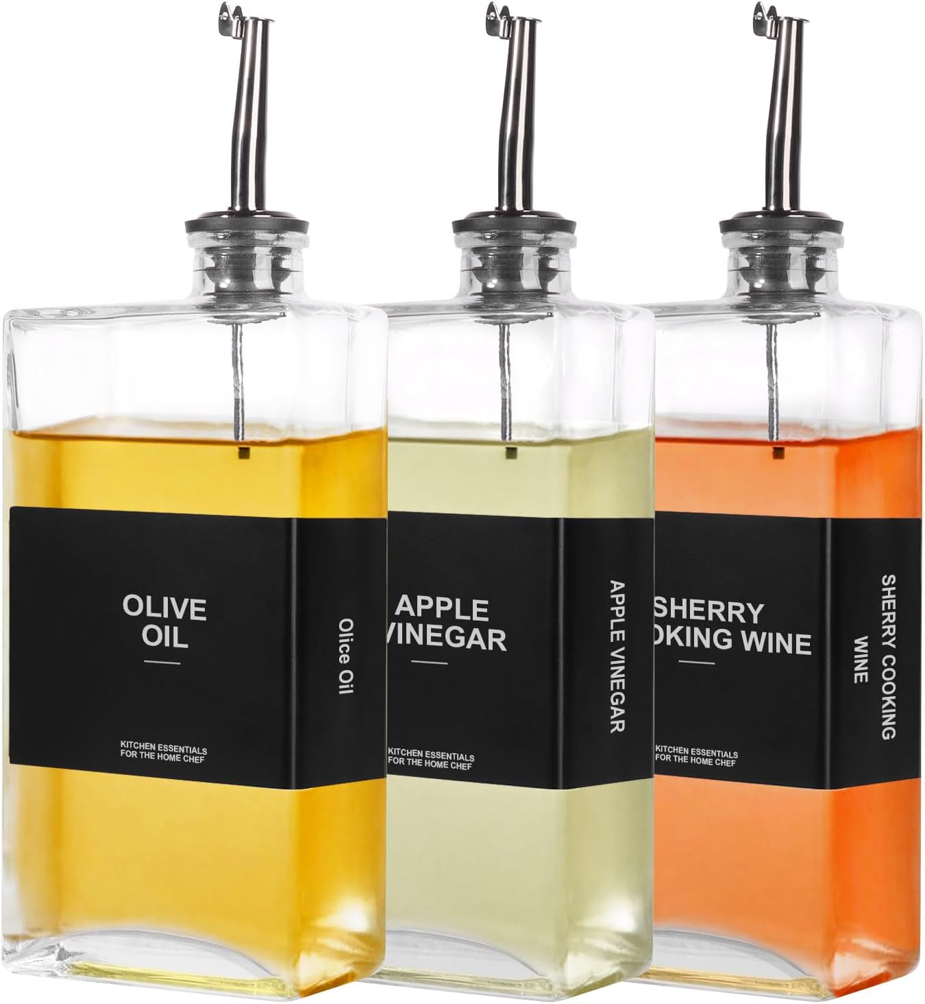 - [HIGH QUALITY & UPGRADE DESIGN] Our cooking oil container is made of superior quality BPA-FREE glass, combining a shatterproof body with a 304 stainless steel spout, rustproof and lightweight, ensuring controlled liquid flow, and preventing any spillage and leakages from staining your countertop. Moreover, each pouring spout has a seal ring, and the cap is fully closed when not in use, keeping your liquid ingredients fresh and original