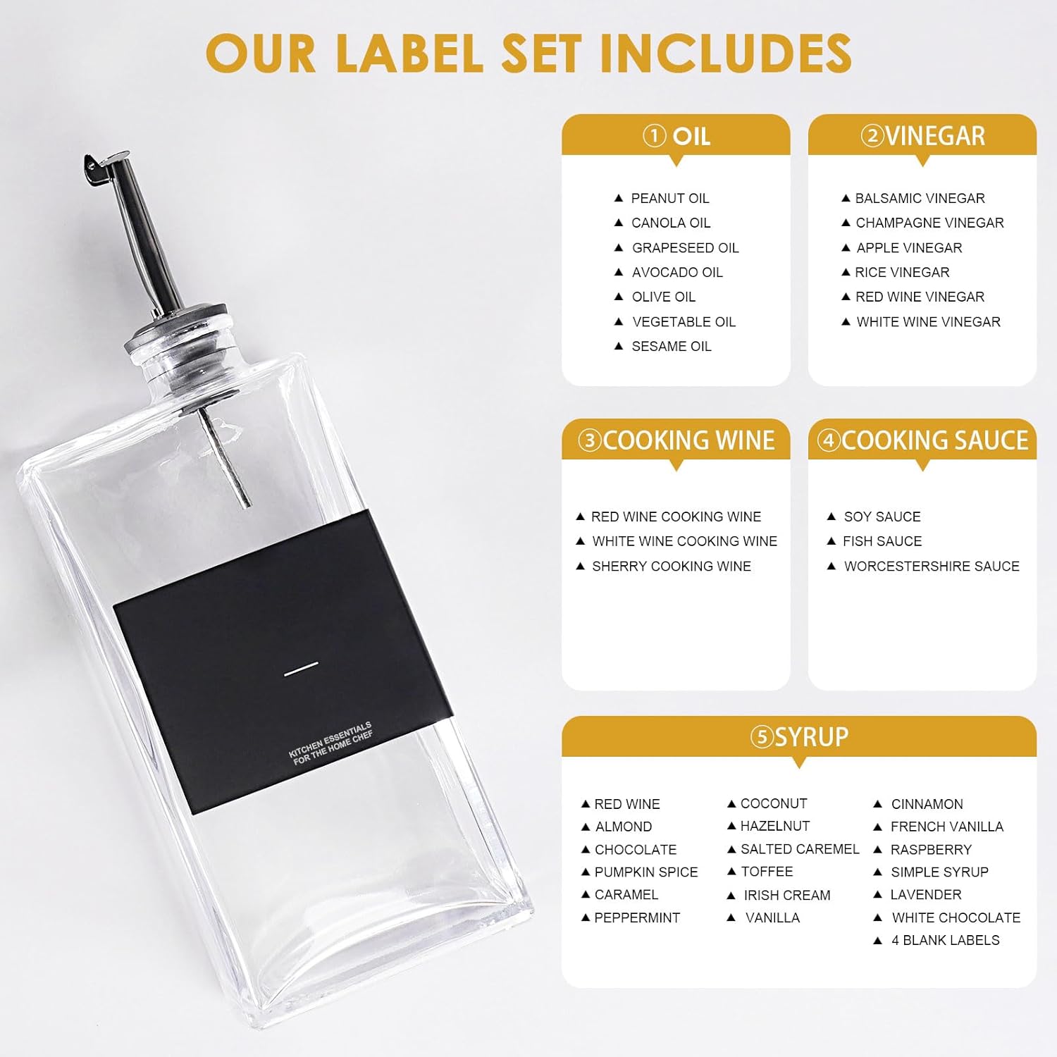 - [MODERN KITCHEN ESSENTIAL] The 40 black printed labels are waterproof, oil-proof, non-rolling, and tear-resistant, making it easy to differentiate your seasonings, and helping you find the right one while you are busy cooking. Also, the food-grade funnels solve the filling and refilling issue, making everything clean and neat, and the cleaning brush allows you to clean the oil decanter thoroughly. Don't worry about the oil stains! Last, the olive oil container set is also ideal for Outside BBQs, Picnics, Camping, Etc