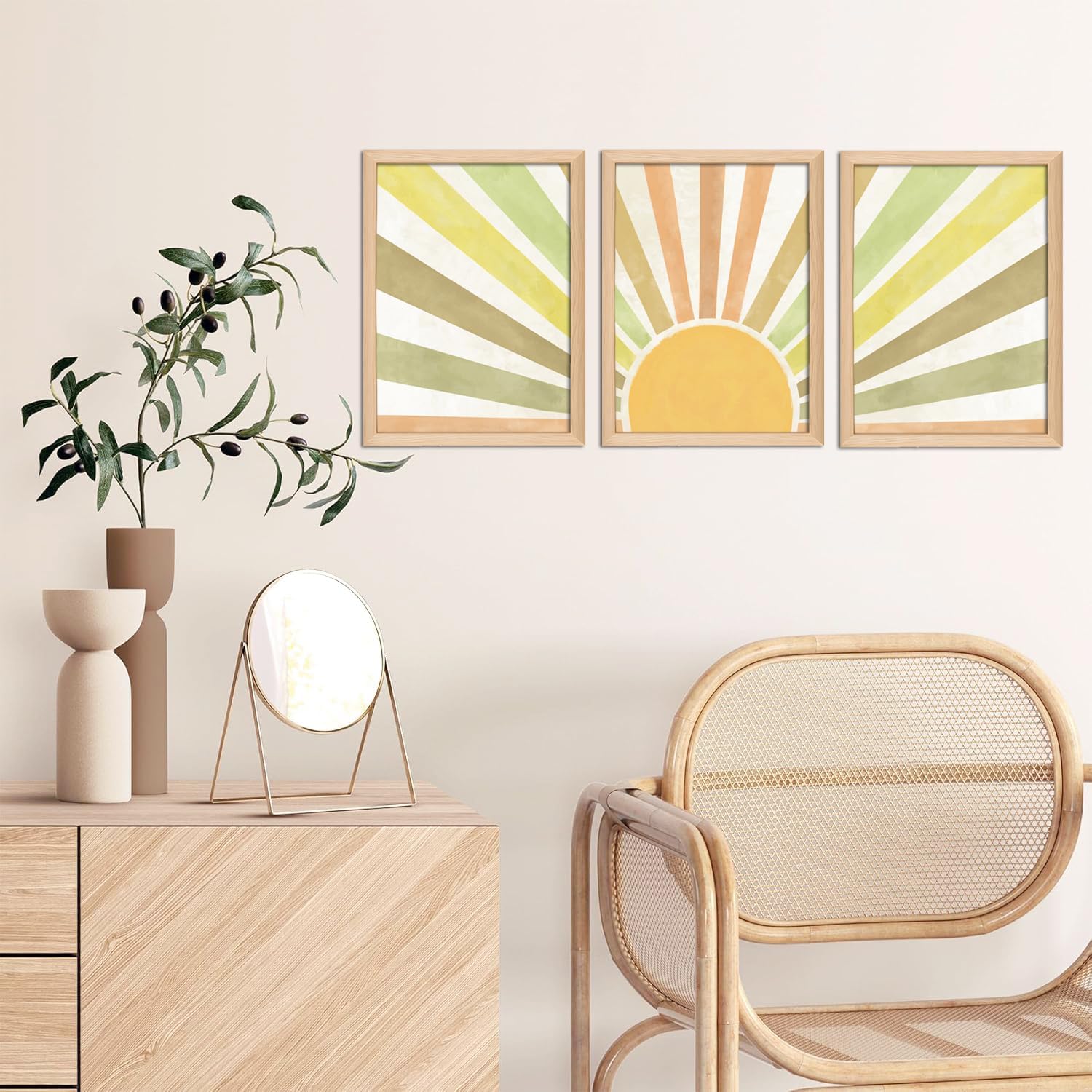 - Boho Wall Art Set of 3 Celebrate the energy of the sun with this Sun Wall Art collection. The bold sunburst pattern, in soft shades of yellow, green, and beige, exudes warmth and positivity that combine abstract sunshine and geometric lines in warm, earthy tones. This set effortlessly complements modern, bohemian, and minimalist decor.