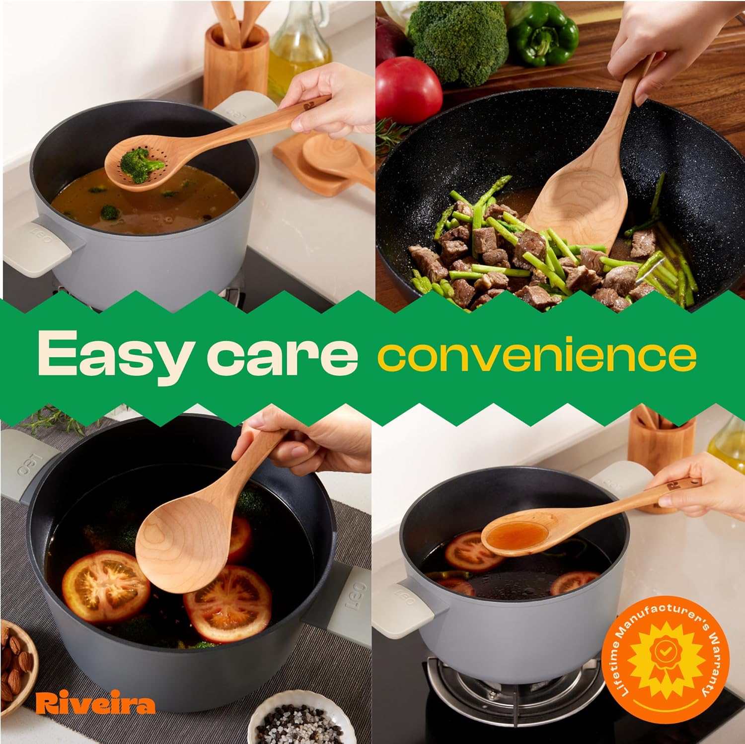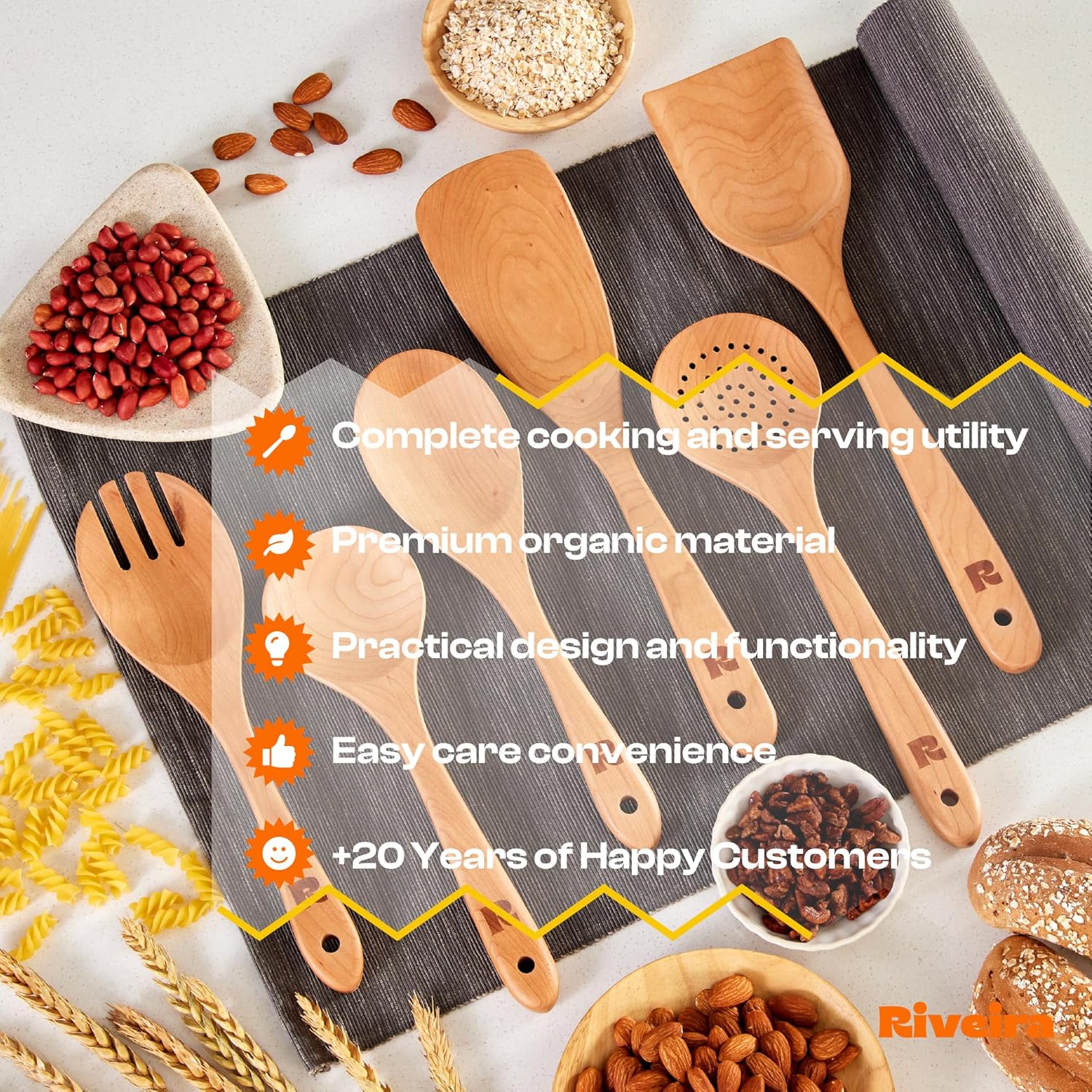 Riveira Cherry Wooden Spoons for Cooking Set of 6 – Natural Cherry Wood Cooking Utensils, Wooden Spatula, Wooden Spoon - Premium Quality Wooden Utensil Set for Non-Toxic Cooking