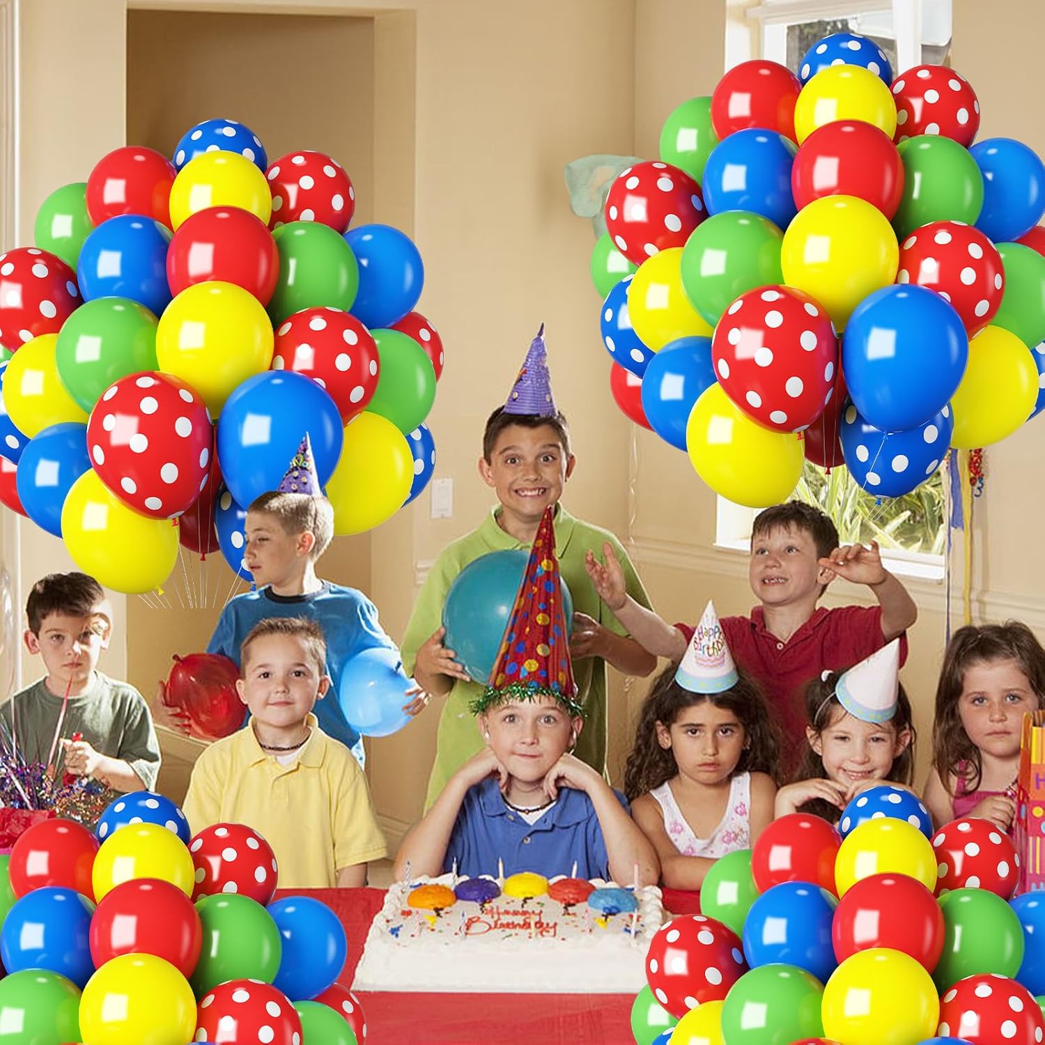 - Balloons for Birthday Party: Includes matte yellow balloons (12 in; 8 pcs ); green latex balloons (12 in; 8 pcs ); dark blue balloons (12 in; 5 pcs ); red helium balloon (12 in; 5 pcs ); blue polka dot balloons (12 in; 4 pcs ); red polka dot balloon (12 in; 4 pcs ) and a roll white ribbon; This balloons matte red green blue yellow can add a unique atmosphere to your birthday party decorations