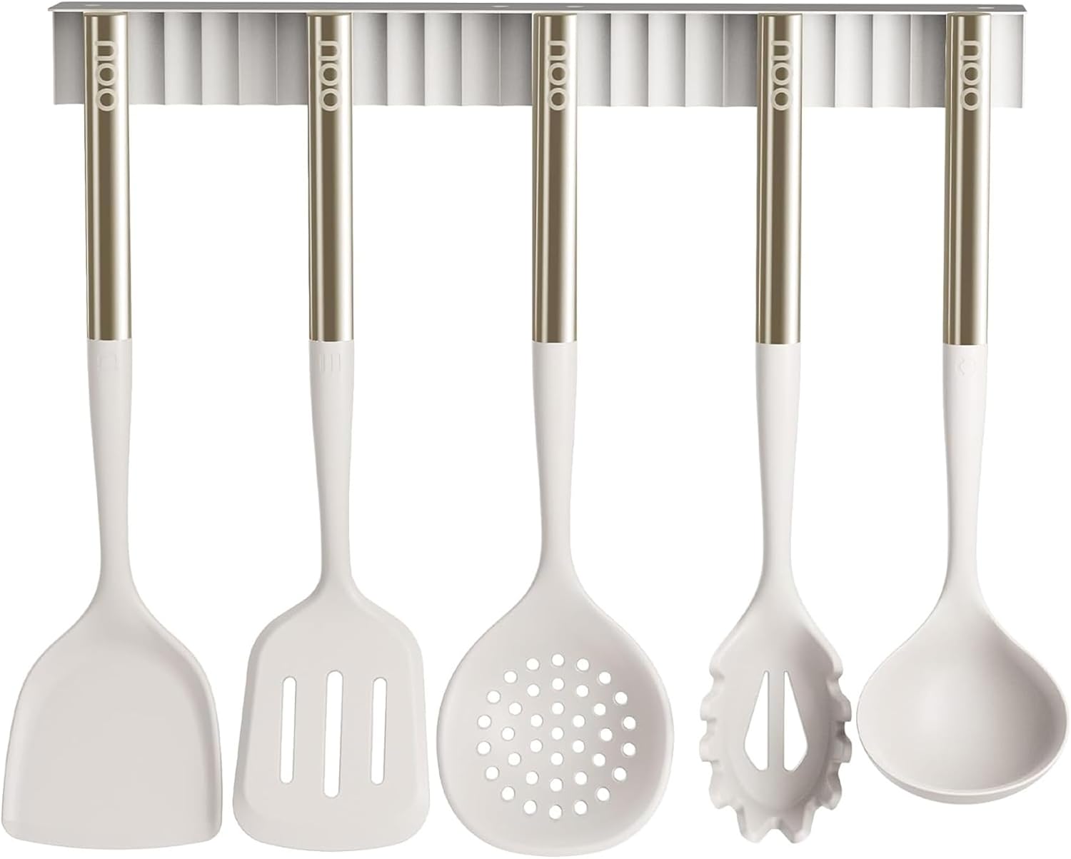 - 【Stylish & Gift-Ready】A must-have 5-piece utensil set with 1 magnetic stand. White silicone heads and gold stainless steel handles add elegance to any kitchen—an ideal gift for weddings, holidays, and housewarming parties.