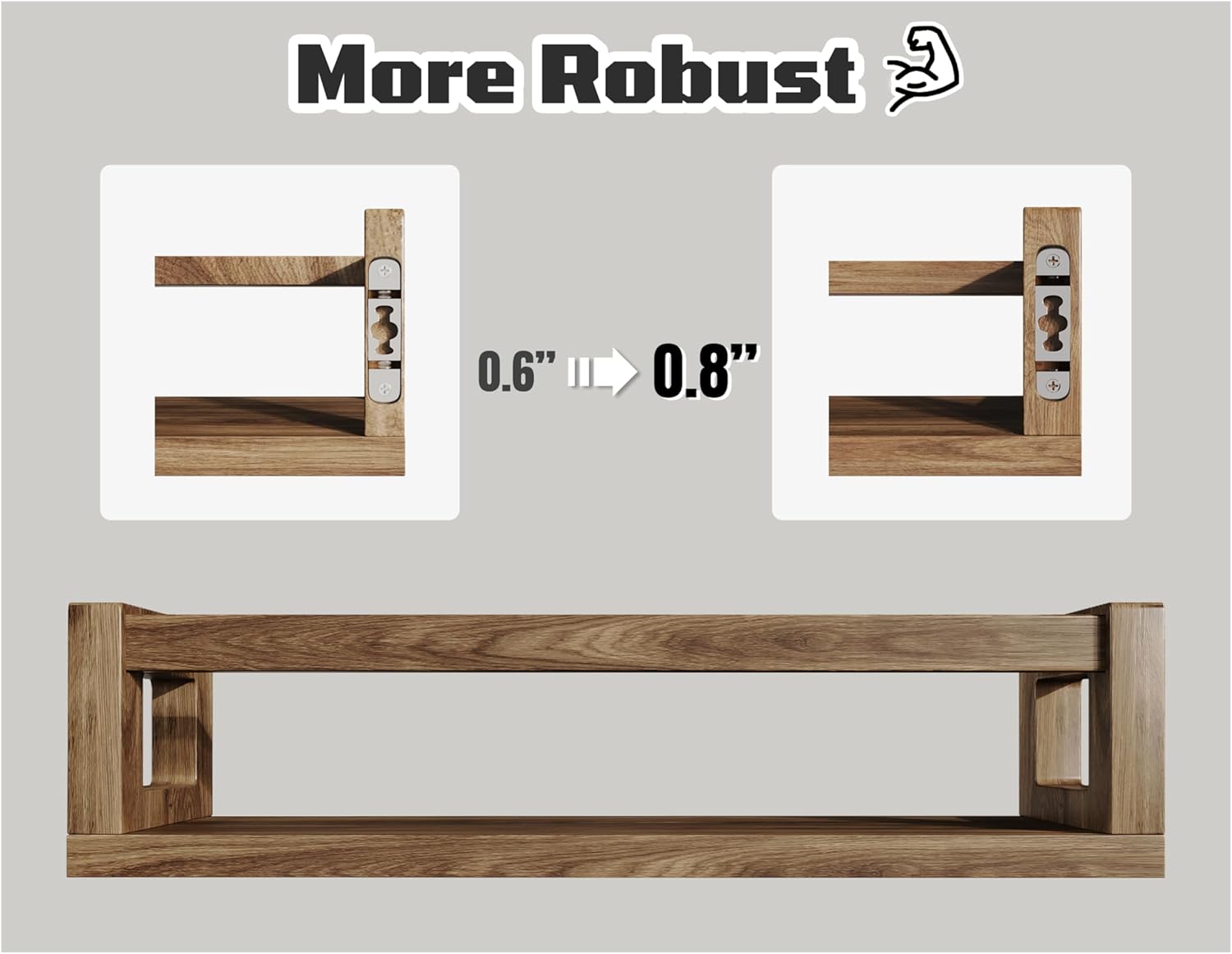 - ăPremium Solid Wood CraftsmanshipăExperience the charm and durability of 100% solid wood. Our upgraded floating shelves feature thicker side panels (upgraded from 0.6 inches to 0.8 inches) to ensure superior stability and enhanced durability, bringing a touch of nature and health to your home environment.
