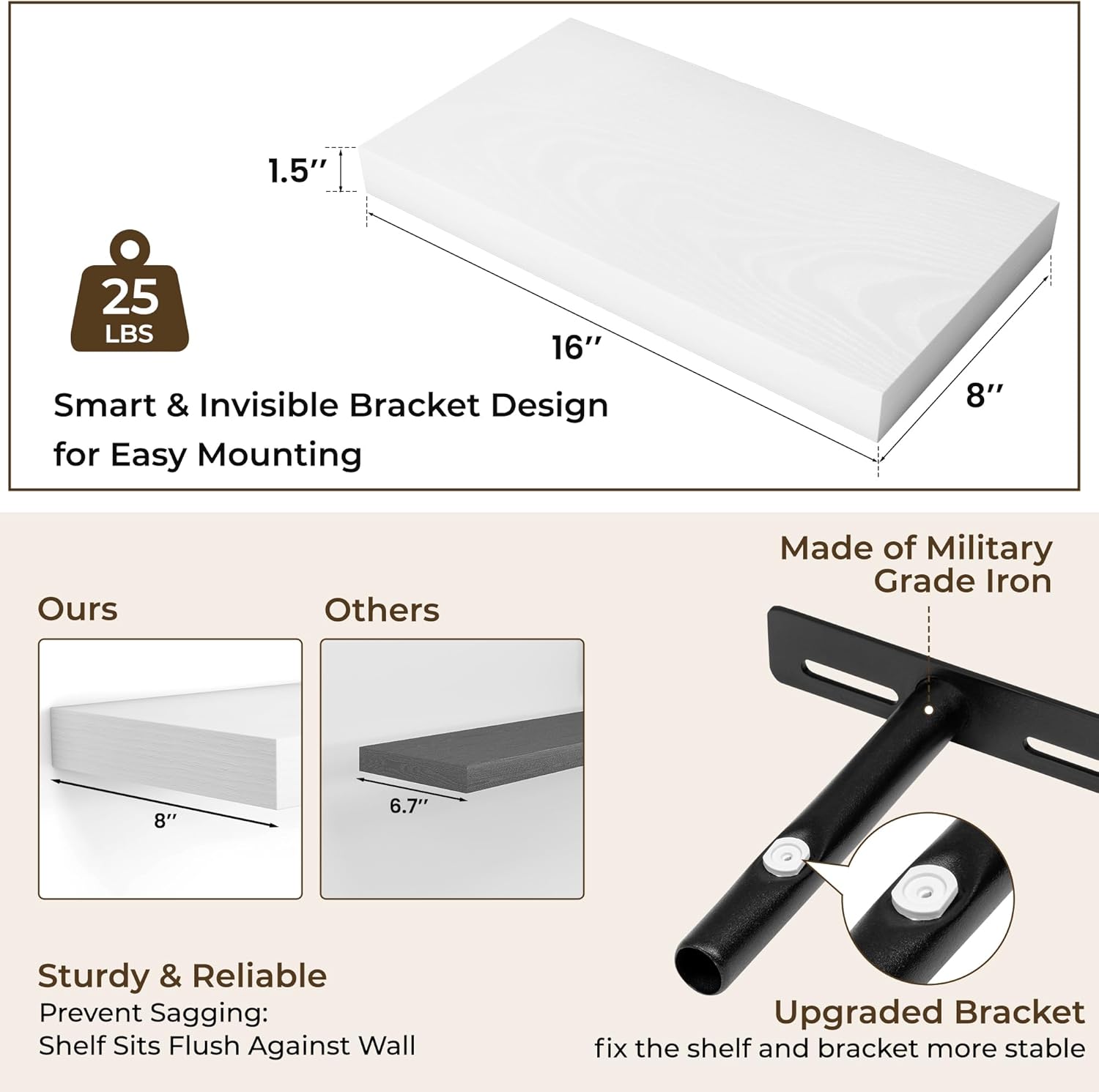 - 16 Inch Floating Shelves for Wall (Set of 2): Each wall shelves are 8 inches in depth and 1.5 inches in thickness. 2-piece set is more cost-effective and practical. Our wall shelf can be used in combination, staggered high or low on the wall, or mounted side-by-side to provide extra storage space for organizing small items and clutter in multiple areas such as kitchens, bathrooms, and bedrooms, creating a clean and smooth look. Multiple colors available