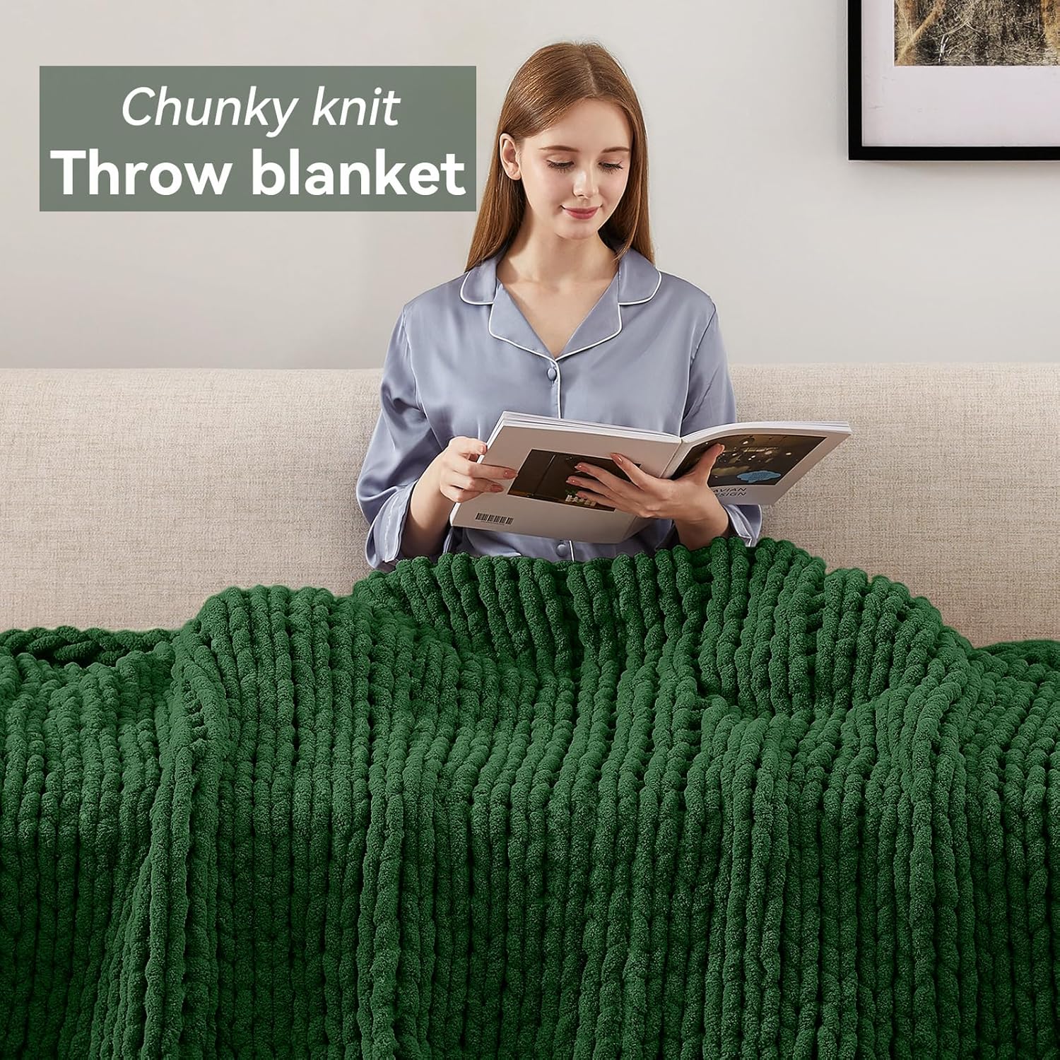Chunky Knit Throw Blanket, 50''*60'' Knitted Throw Chenille Yarn for Bed Couch, Handmade Grass Green Crochet Big Thick Blanket, Machine Washable Cute Comfy Blanket for Home Decor