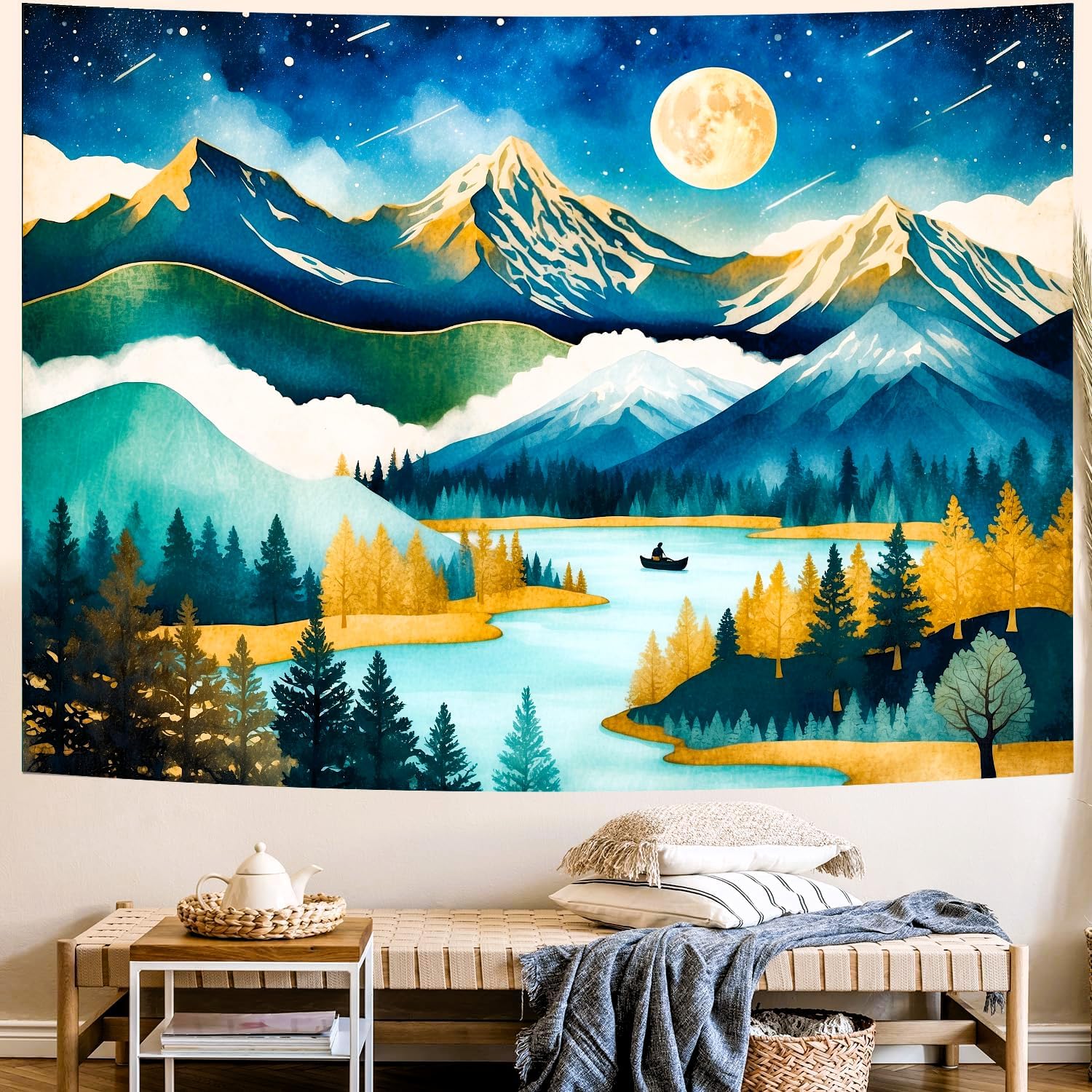 Delur Mountain Tapestry Boho Moon Stars Starry Night Tapestry Wall Hanging Forest Tree Nature Landscape Psychedelic Headboard for Bedroom Living Room Home Decor (59.1" x 78.7")