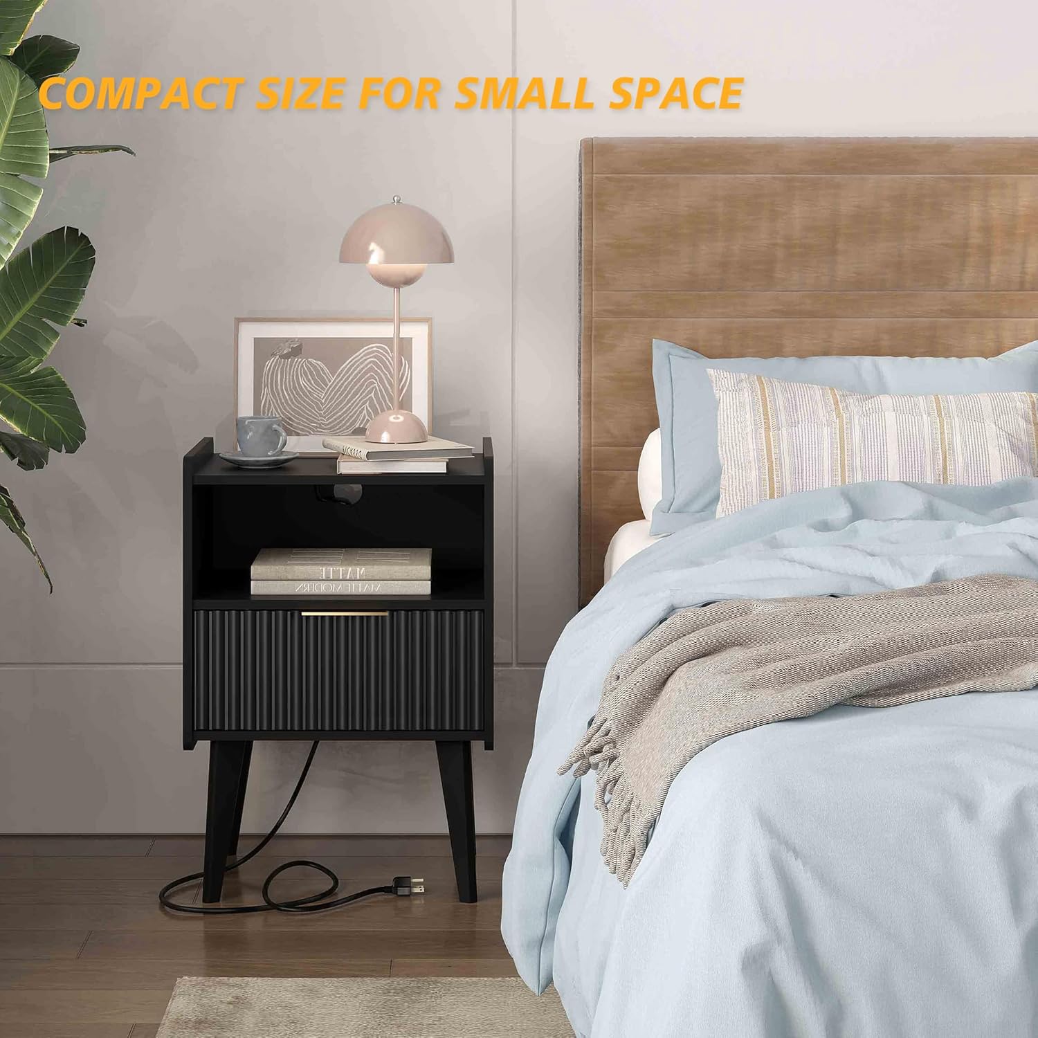 Fluted Nightstand with Charging Station, Modern Bedside Table with Drawer,Black Nightstand with Solid Wood Legs, End Table,Side Table for Living Room,Bedroom Black CTG57BKE
