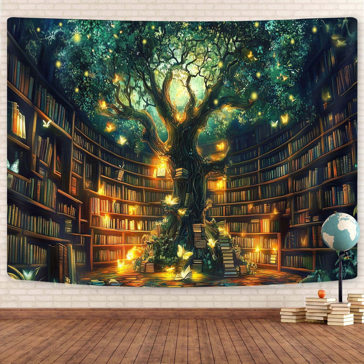 Fantasy Library Tapestry, Fairytale Tree Magic Bookshelf Aesthetic Tapestries for Classroom, Witchy Fairy Tree Mysterious Vintage Bookshelf Book Art Tapestry Wall Hanging College Room Bedroom, 40"X30"