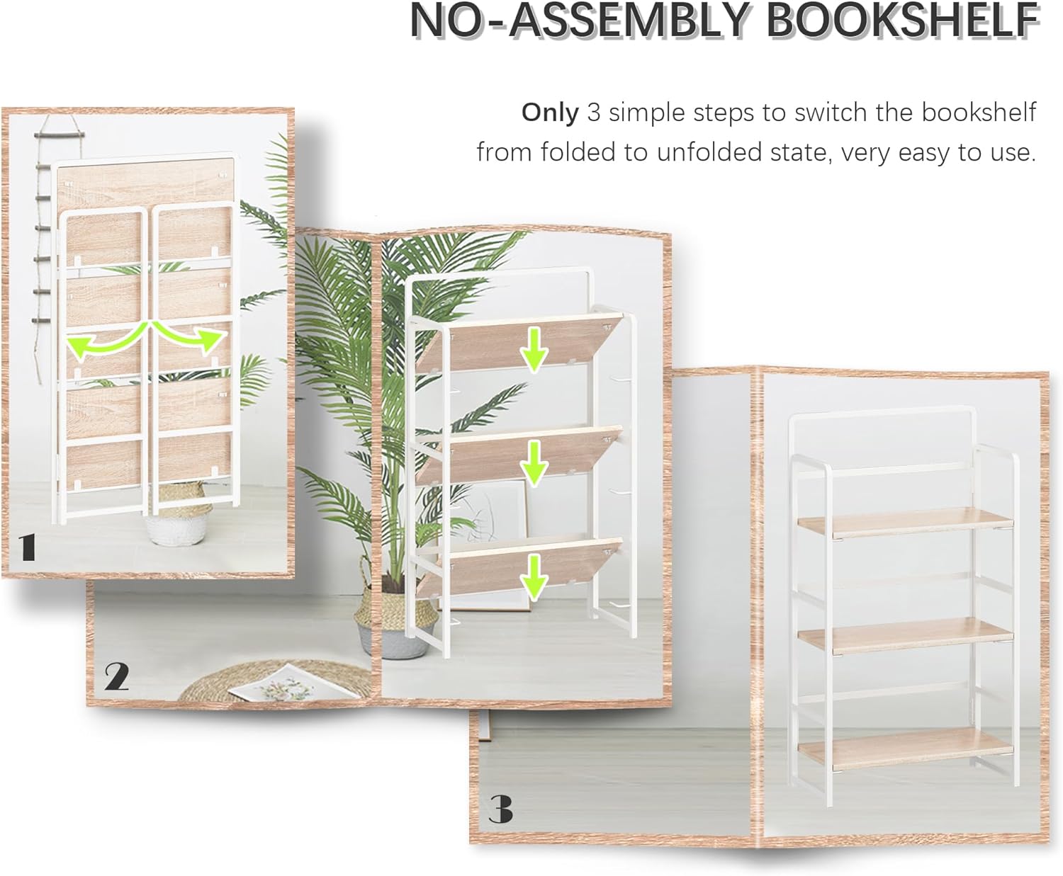 - ăNo Tools Are Needed Bookshelf ăNo screws need to be installed, and you can say goodbye to complicated installation steps. The foldable design without installation makes it possible for you to completely free your hands. You can unfold and fold up the bookshelf in just 30 seconds
