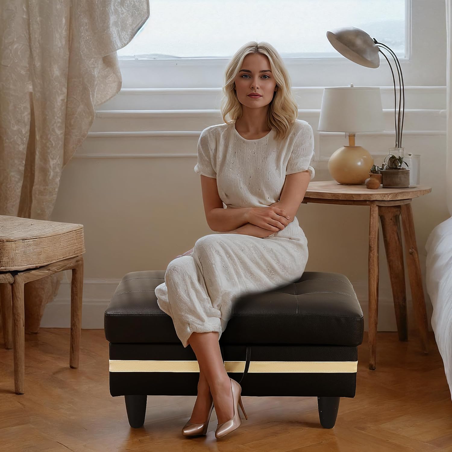 Ottoman Rectangular Storage Ottoman Bench, Faux Leather Footrest, Coffee Table, Stool Footstool with Hinged Lid for Living Room, Bedroom, Entryway, Black with White Strip, 35"x23.5"x17.5"
