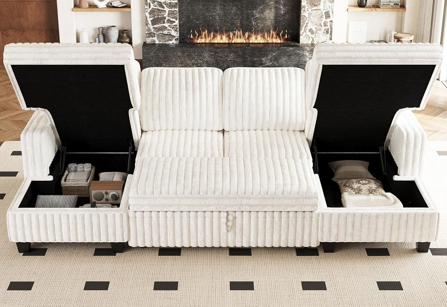 Belffin Modular Sectional Sleeper Sofa with Pull Out Couch Bed Corduroy Double Chaise with Storage White Couch
