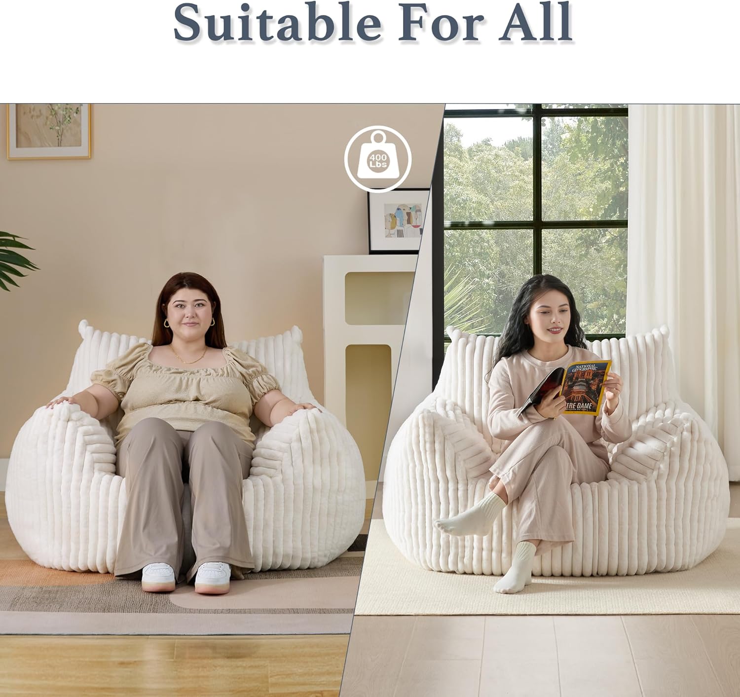 - Spacious and Roomy: Designed wide 4 feet, up to 400Lbs Weight capacity to accommodate adults and teens of the most of sizes, this foam bean bag provides ample space to stretch out or share with a friend. Its family room bean bag appeal makes it ideal for relaxing alone or hanging out with others. The bean bag's Dimension is 46.06"D x 38.58"W x 29.53"H.