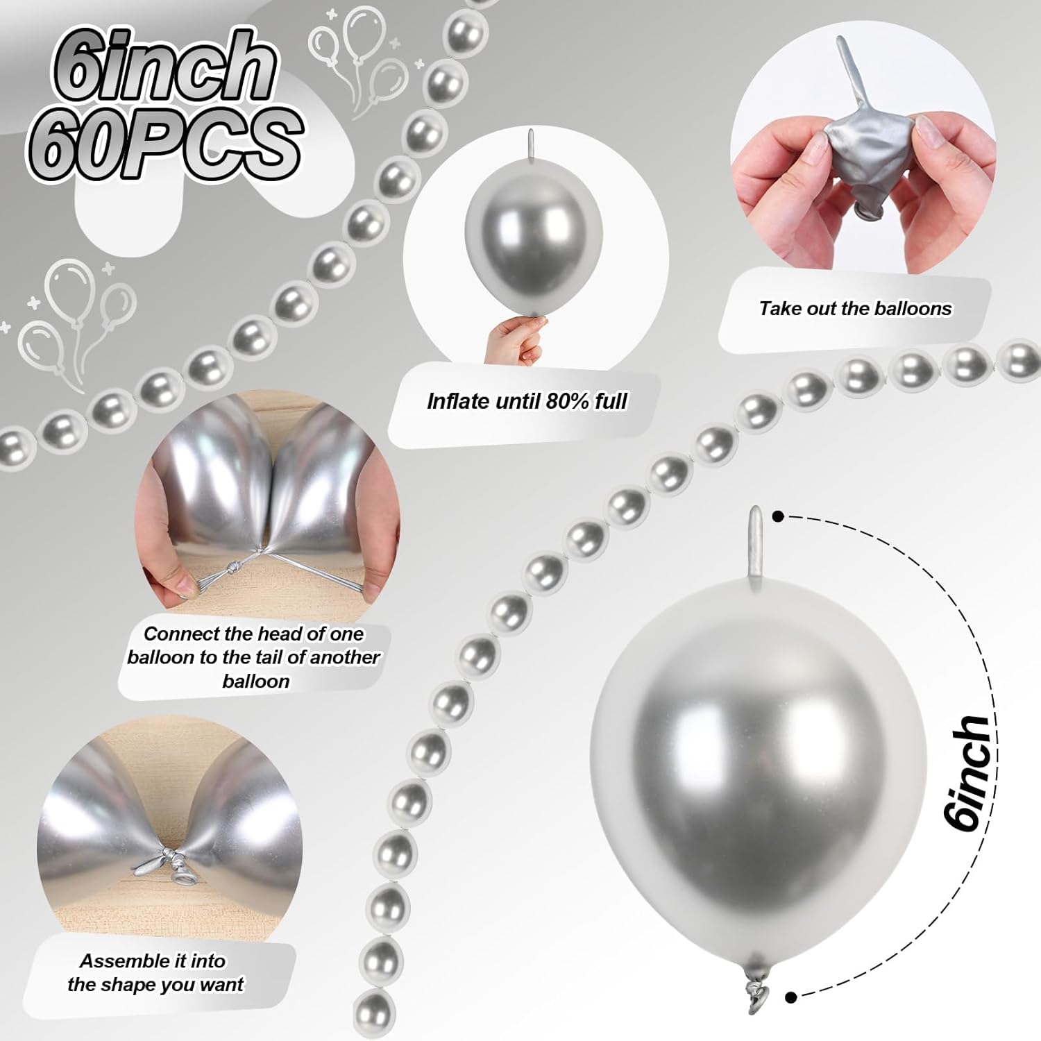 - 💫Balloon Chain Garland - You will receive 60 pcs of 6 inch metallic chrome silver link balloons. Our linked balloons have a unique tail design that allows balloons link to be easily. More convenient and easier to assemble than regular balloons.